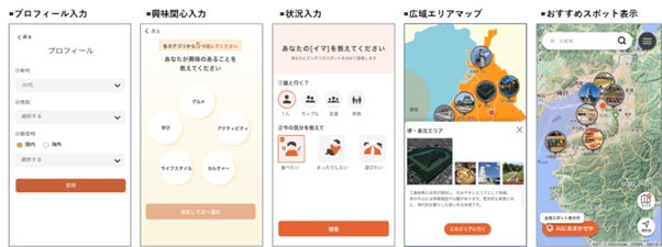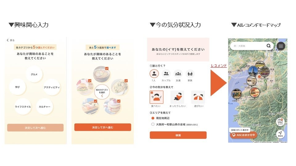 各カテゴリから興味のあることを複数選択し、同行者や気分の情報を取得。興味のあるエリアを選定し、AIがその時の利用者に合ったスポットを提案します。
