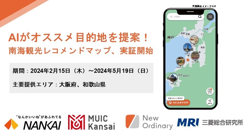 なお、本サービスは南海電鉄沿線をフィールドとして、MUIC Kansaiの「課題解決プログラム」内の実証実験として実施するものであり、南海電鉄は掲載スポットの提供や本サービスの普及促進を担い、MRIはNew Ordinaryが提供するAIのレコメンド精度向上に協力します。南海電鉄、MUIC KansaiおよびMRIは、AIによる目的地提案技術に強みを持つスタートアップのNew Ordinaryと連携することで、関西における観光地の周遊拡大を促進していきます。