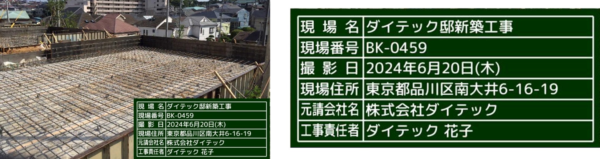 「現場Plus/現場Plus TF」の工事写真機能は、現場で撮った写真をそのままリアルタイムで共有できる機能です。撮影した工事写真には、大きさ・貼り付け位置・記載項目などを自由にカスタマイズできる電子小黒板の直接挿入が可能です。今回、写真改ざん検知機能に対応したことで、「現場Plus/現場Plus TF」で管理されている工事写真の信憑性が担保されていると認められました。