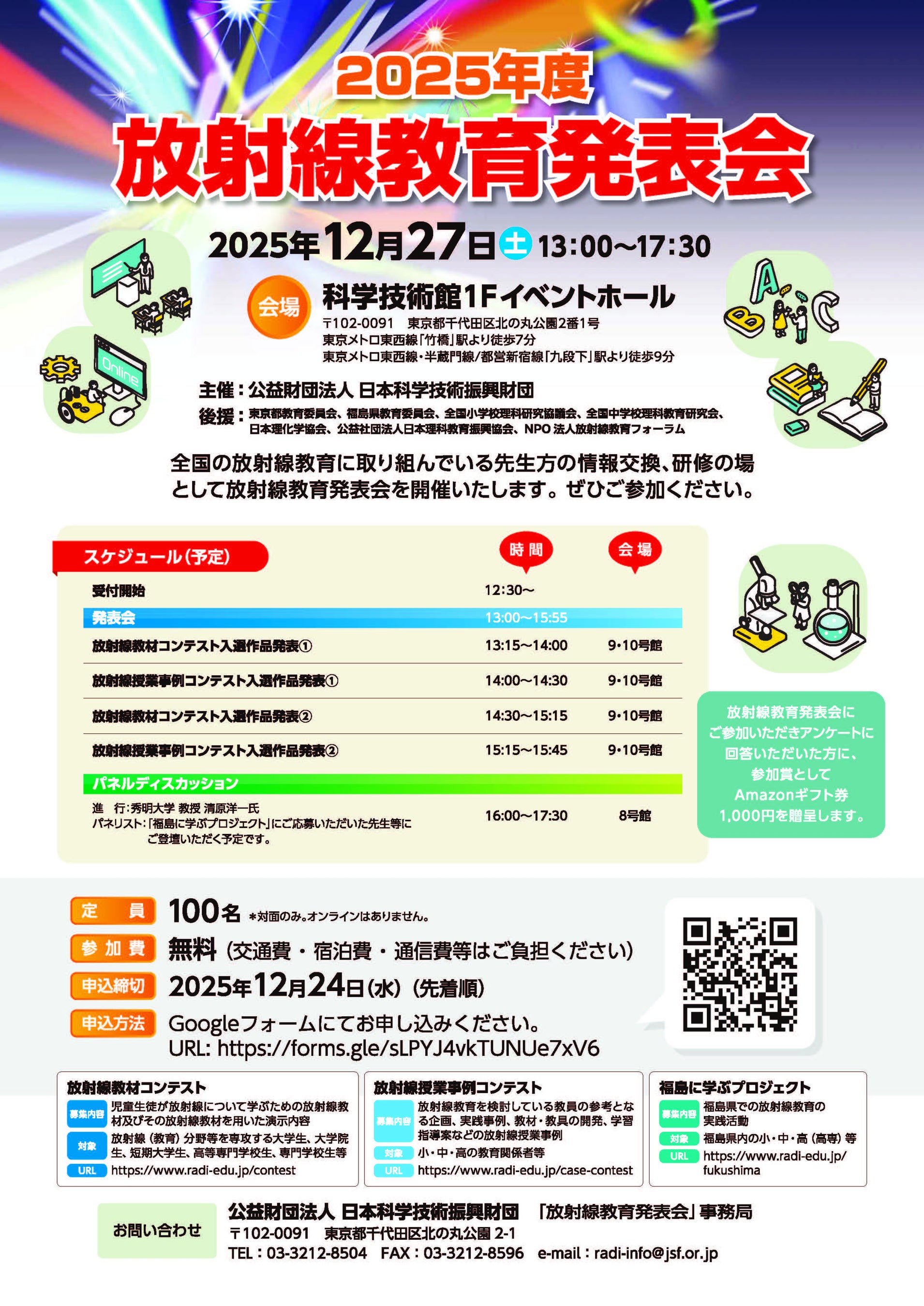 2025年12月27日(土) 10:30~11:45 表彰式 13:00~15:55 放射線教育発表会①発表会 16:15~17:30 放射線教育発表会②パネルディスカッション |