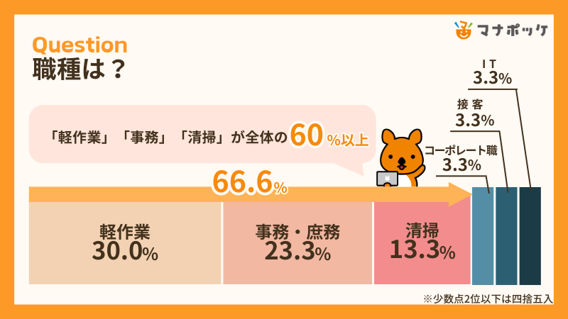 ⑦ 職種は「軽作業」「事務」「清掃」の順で多い