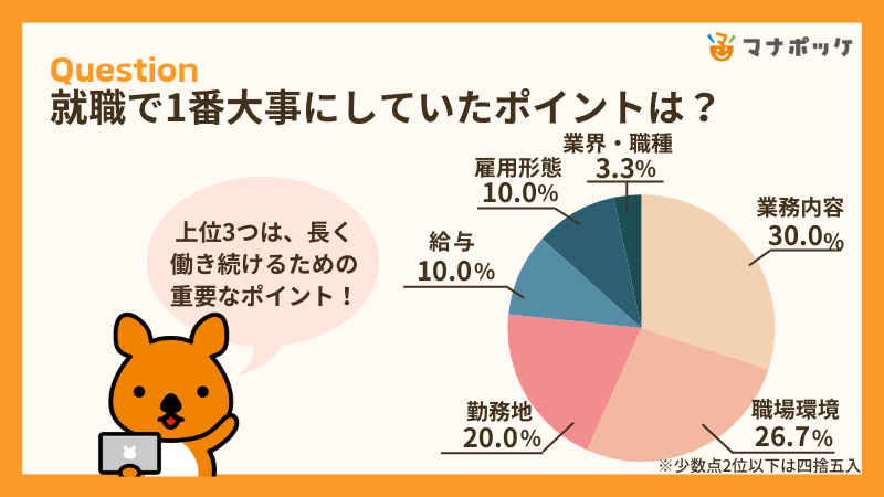 就職で1番大事にしていたポイント第1位は「業務内容」、2位「職場環境」、3位「勤務地」と続きます。