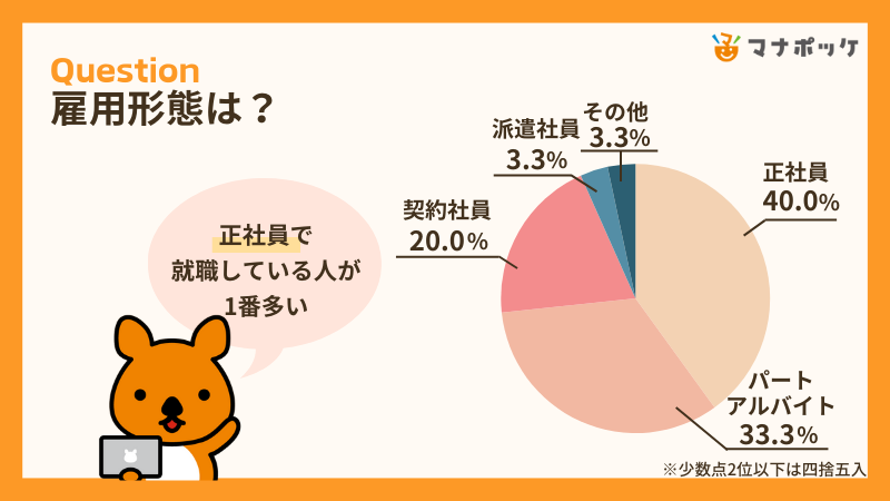 「正社員(40.0%)」で就職している人が1番多く、「パート・アルバイト(33.3%)」、「契約社員(20.0%)」と続きます。