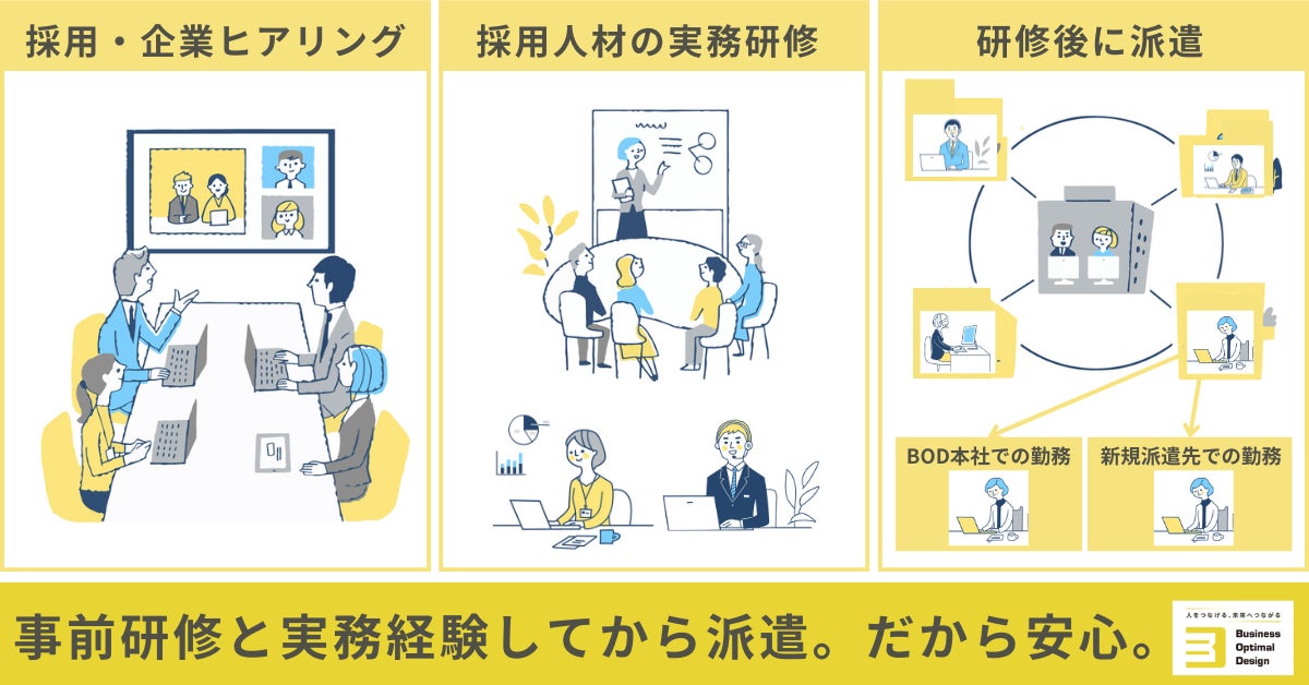 BODの派遣事業の特徴は、ただ派遣に行っていただく「派遣のみ」のスタッフではなく、事前にBOD内で研修をしたスタッフを派遣している、という強みがあります。具体的には、時間契約社員(アルバイト)としてBOD内で雇用した後、派遣先で稼働いただく前に、BOD内でパソコン研修を兼ねた実務経験を積んでいただいています。既に経験が豊富なスタッフについては、そのまま派遣先にて稼働いただいています。