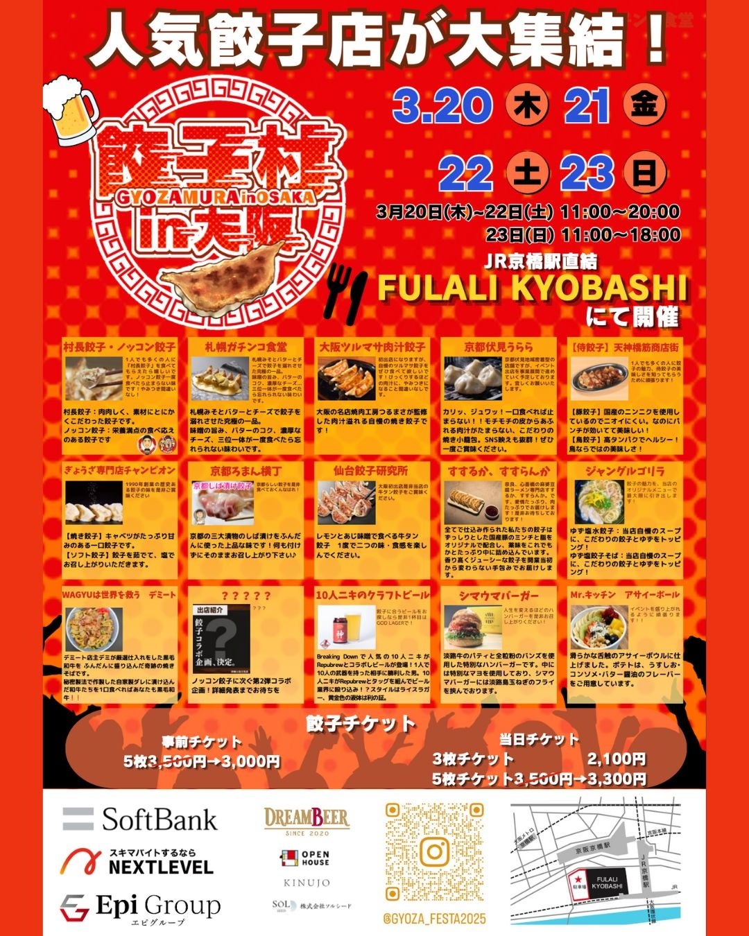 株式会社おにぎり村(代表取締役:池尾俊哉)とFoodFes株式会社(代表取締役:稲垣一馬)は2025年3月20日(木),21日(金),22日(土),23日(日)の4日間、大阪・京橋”FULALIKYOBASHI”にて開催する「餃子村 in 大阪」の事前チケットを好評発売中です!販売はイベント開催前日の3月19日(水)まで!