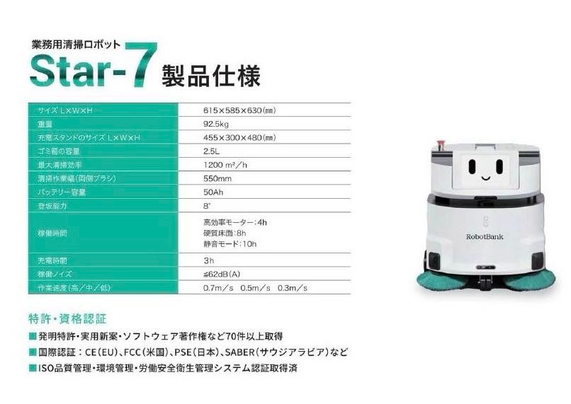 ロボットバンク株式会社(本社:東京都新宿区)は、この度、様々な現場の清掃業務を効率化・スマート化するため、水を使えない場所でも使用できる業務用清掃ロボット『Star-7』の販売を開始いたします。