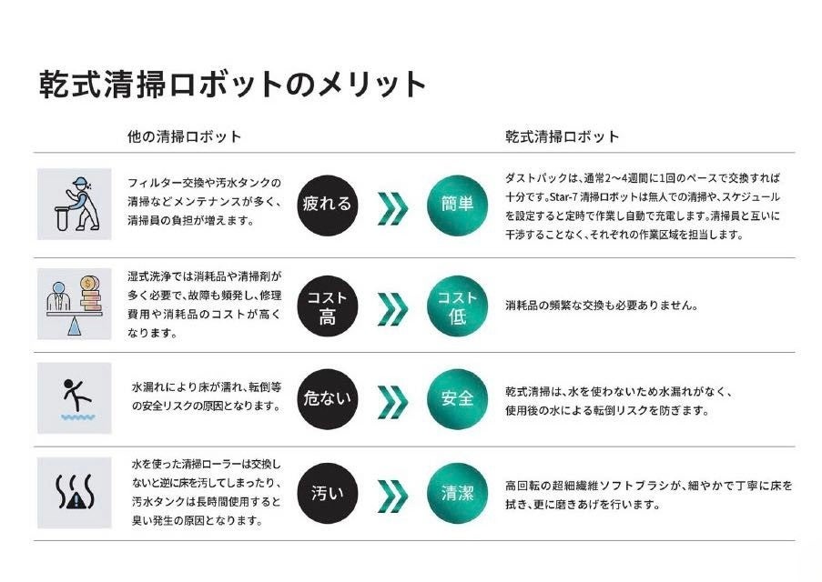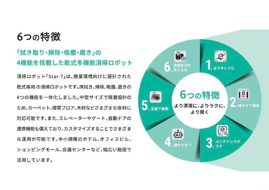 ロボットバンクは、これらのニーズに応えるため、水を使わずに徹底的な清掃とスマートな運用を可能にする業務用清掃ロボット『Star-7』の販売を開始いたしました。