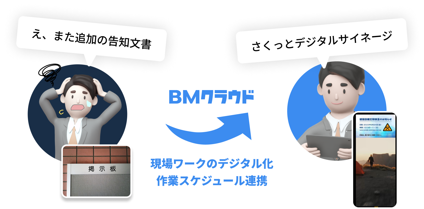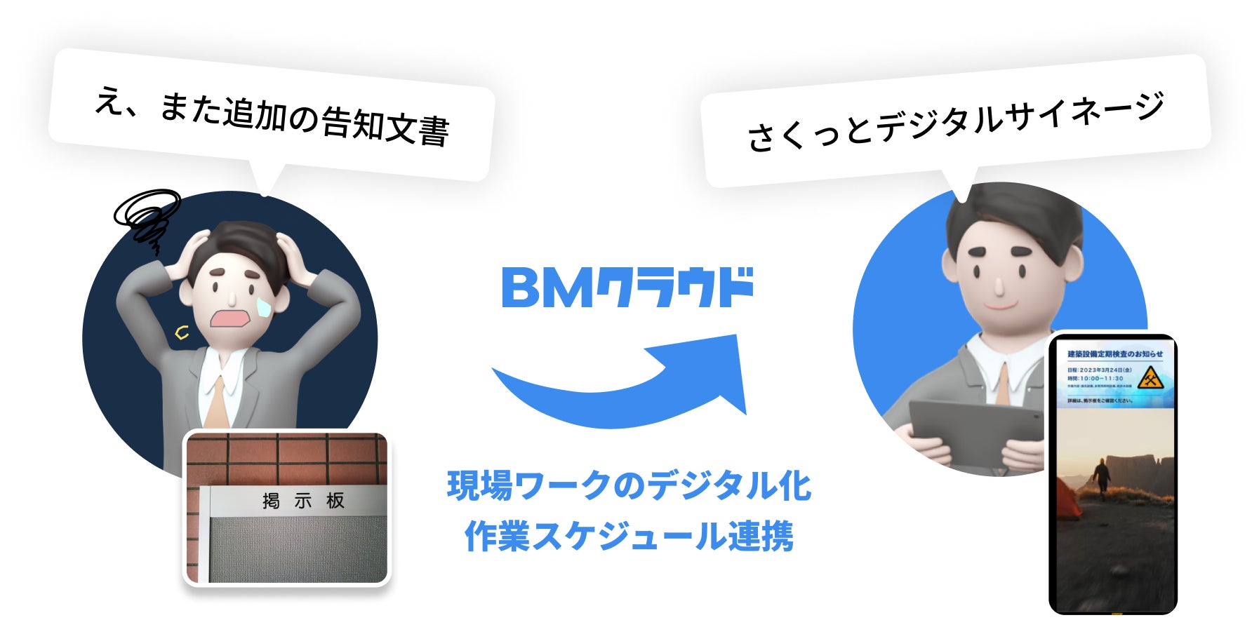 またBMクラウドと連携することで、エレベーターホールのサイネージに消防点検や貯水槽点検などを告知することも可能です。