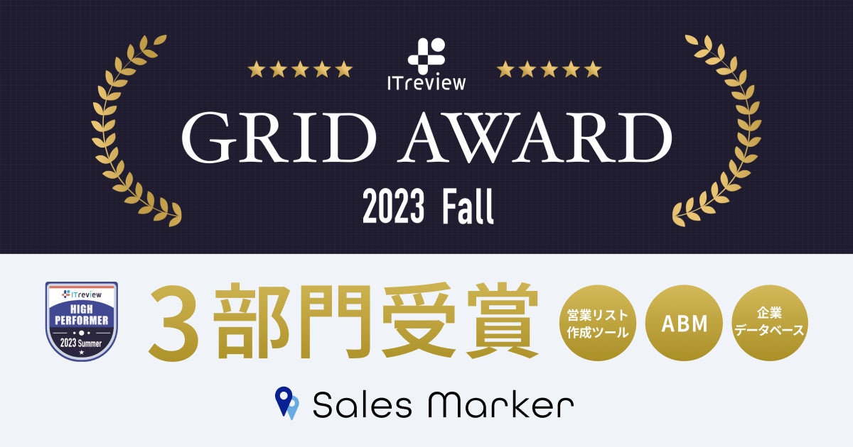 そしてこのたびの「ITreview Grid Award 2023 Fall」では、それらの実績によってABM(アカウントベースドマーケティング)、企業データベース、営業リスト作成ツールの3部門で「ハイパフォーマー」に同時認定となりました。なお、今回の受賞は前回に続き3期連続となります。