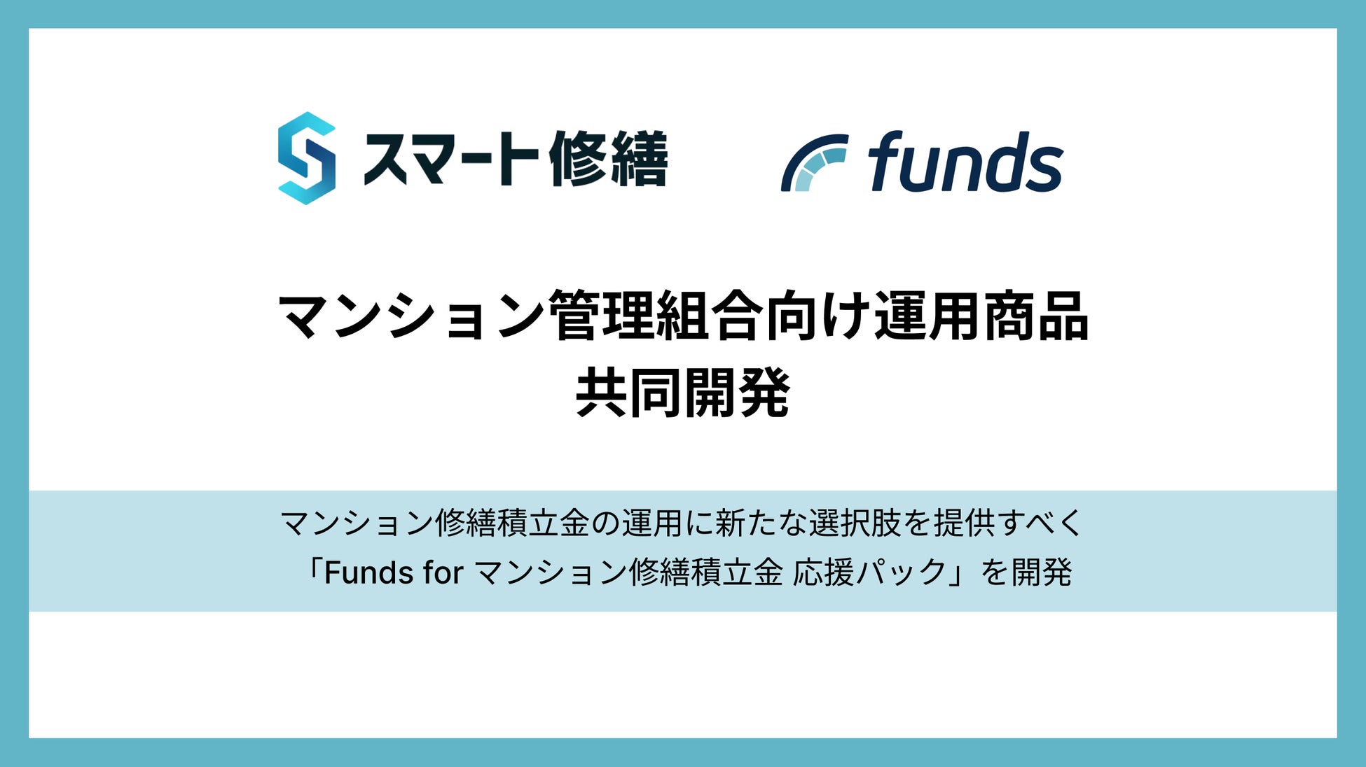 マンションやビルなど大型建物の修繕工事の見積、工事支援サービスを展開する株式会社スマート修繕(本社:東京都港区、以下 スマート修繕)は、固定利回り投資の資産運用サービス「Funds(ファンズ)」を運営するファンズ株式会社(本社:東京都渋谷区、代表取締役CEO:藤田 雄一郎、以下 「ファンズ」)とマンション管理組合向け運用商品「Funds for マンション修繕積立金 応援パック」を共同開発いたしました。