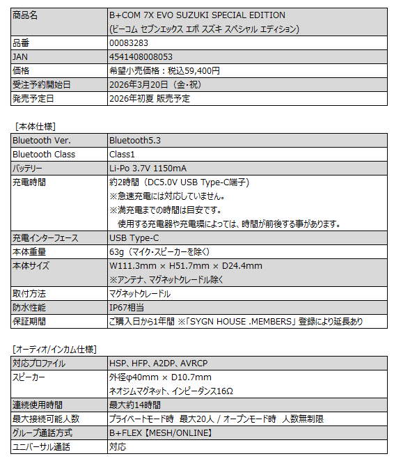 B+COM 7X EVO SUZUKI SPECIAL EDITIONスペック表