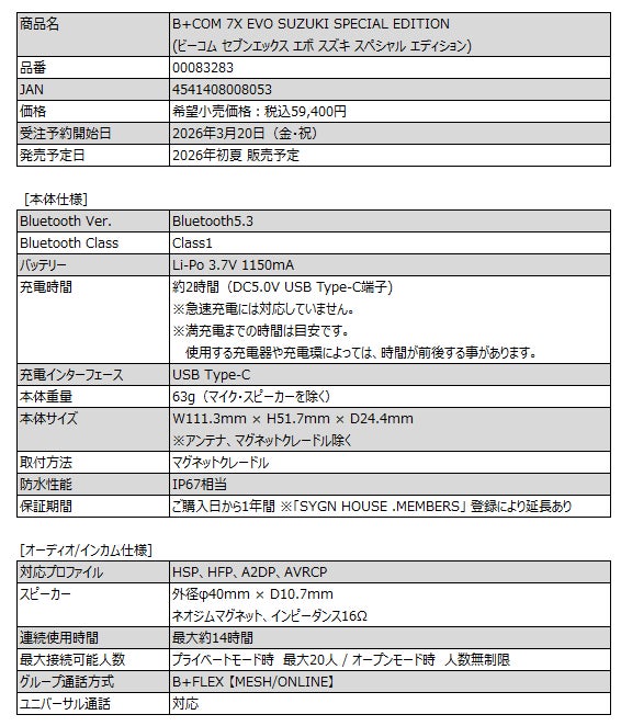 「B+COM 7X EVO SUZUKI SPECIAL EDITION」発売のお知らせ2026年夏頃発売予定