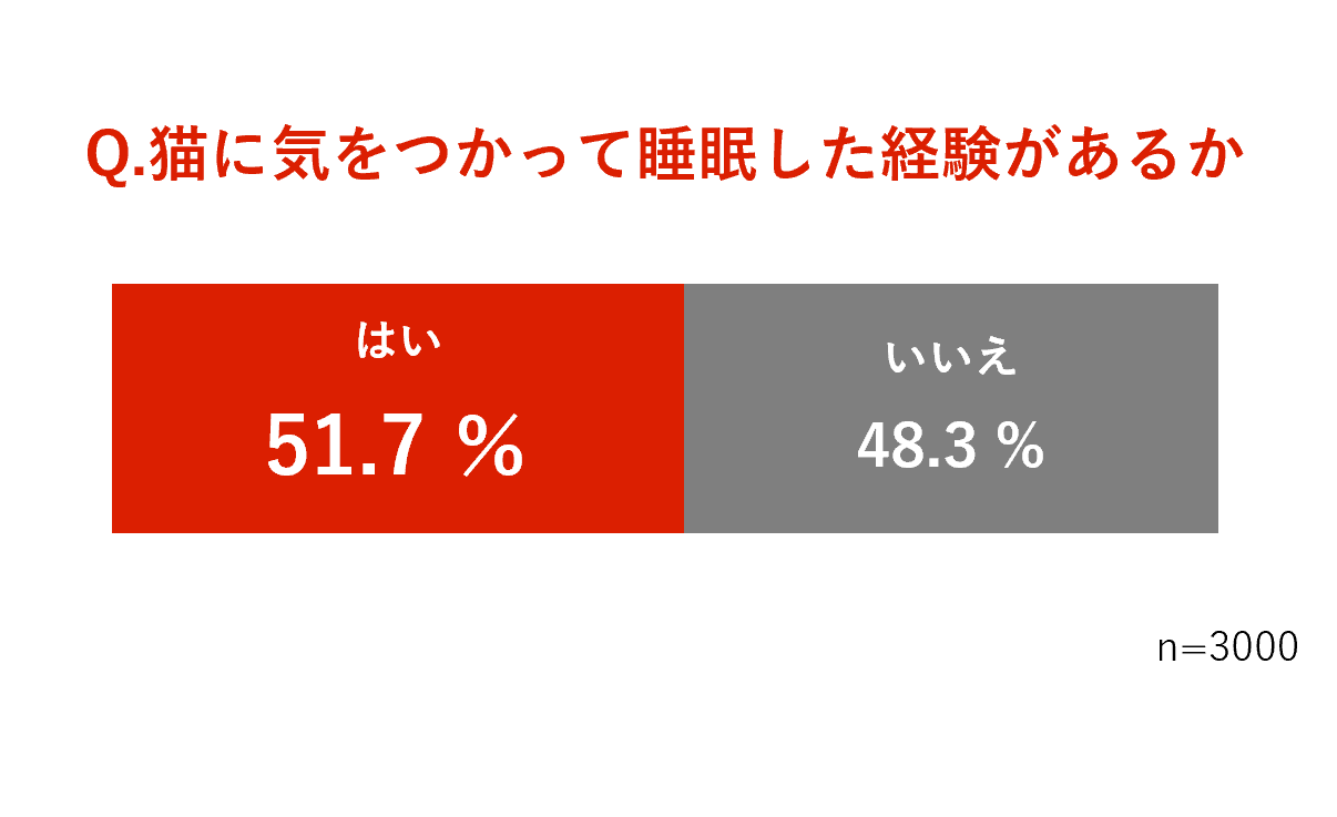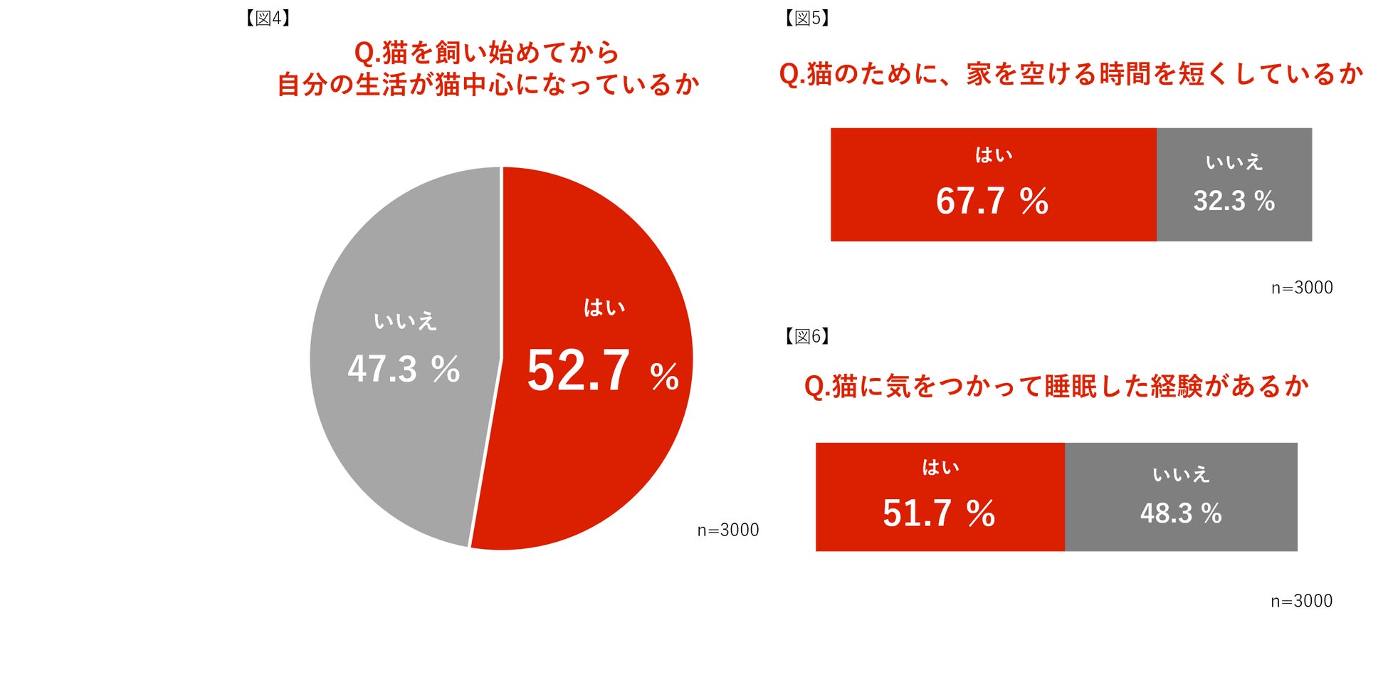 昨年に引き続き、2人に1人が、猫を飼い始めてから自分の生活が猫中心の生活になっていることも明らかになりました【図4】。 また猫との生活について行った調査では、「猫を飼ってから、インドア派になった」「猫を飼ってから、生活リズムに変化があった」と回答した人は、昨年よりもやや増加していることもわかりました。さらに、「猫のために家を空ける時間を短くしている」人は67.7%【図5】、「睡眠時に気をつかって寝返りを控えたことがある」人は51.7%【図6】と、生活そのものが愛猫を中心に回っている様子も判明。