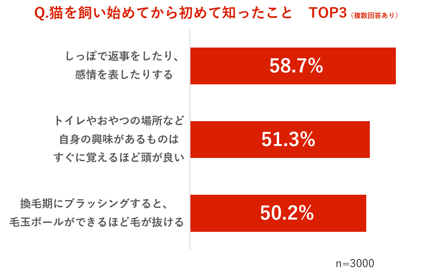 また、「しっぽで返事をする」「おやつの場所をすぐ覚える」など、猫を飼って初めて知った「猫の賢さエピソード」も上位に【図3】。猫との暮らしは、理解し合える深い関係へと進化していることがわかりました。