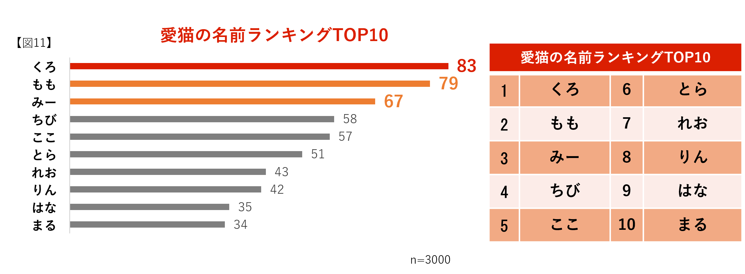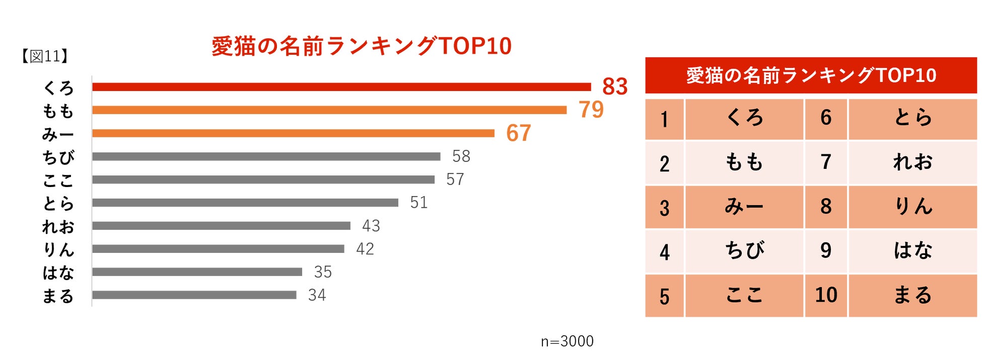 愛猫の名前を調査したところ、名前の種類は約2300種類も見受けられました。その中でも最も多かった名前は、毛色が黒を連想させるような「くろ」が1位になりました。続いて、かわいらしく、やわらかい響きの「もも」、「みー」がランクインしました。また、1位同様に毛色や毛の模様をイメージするような「れお」「とら」もランクインしました【図11】。