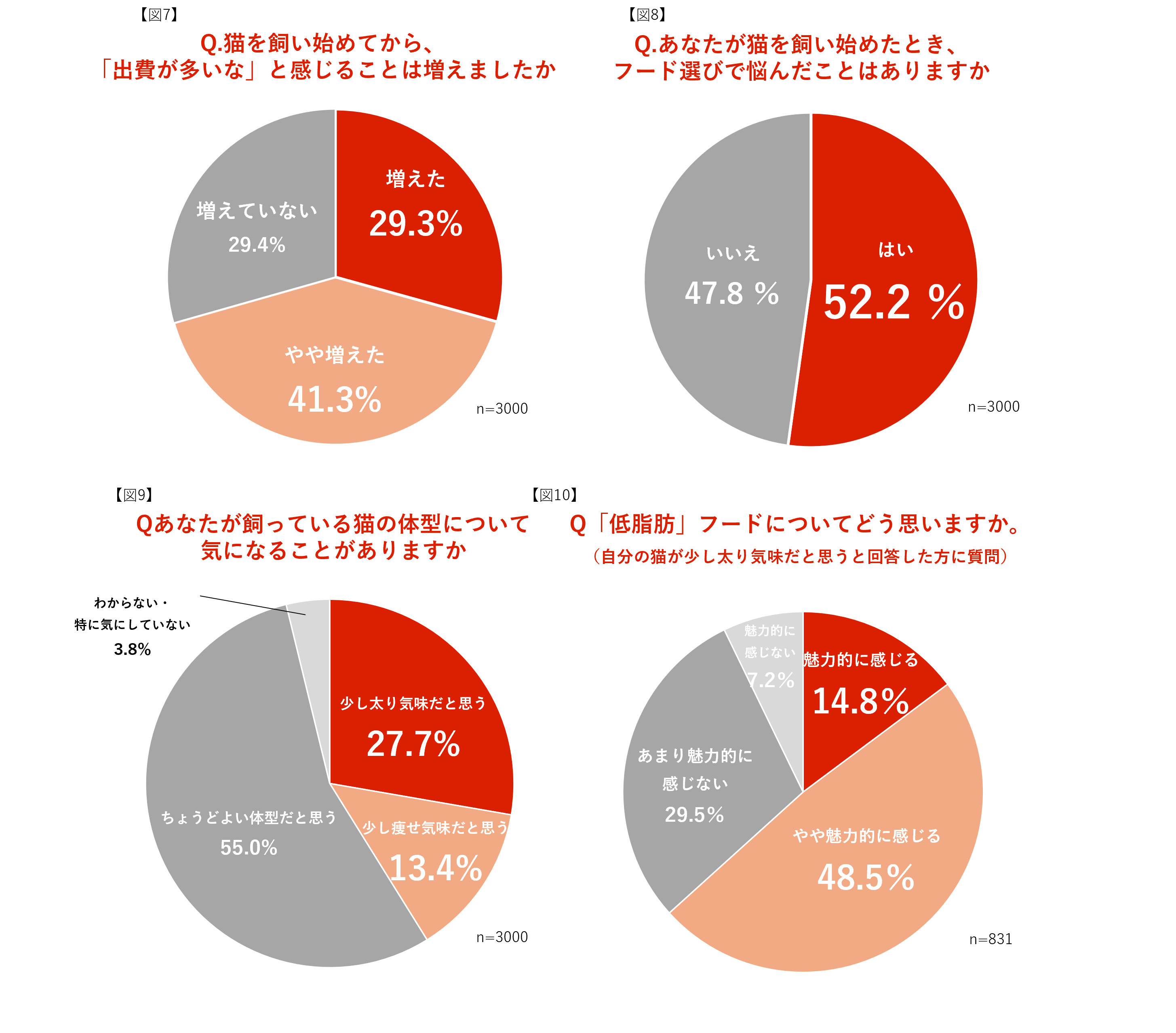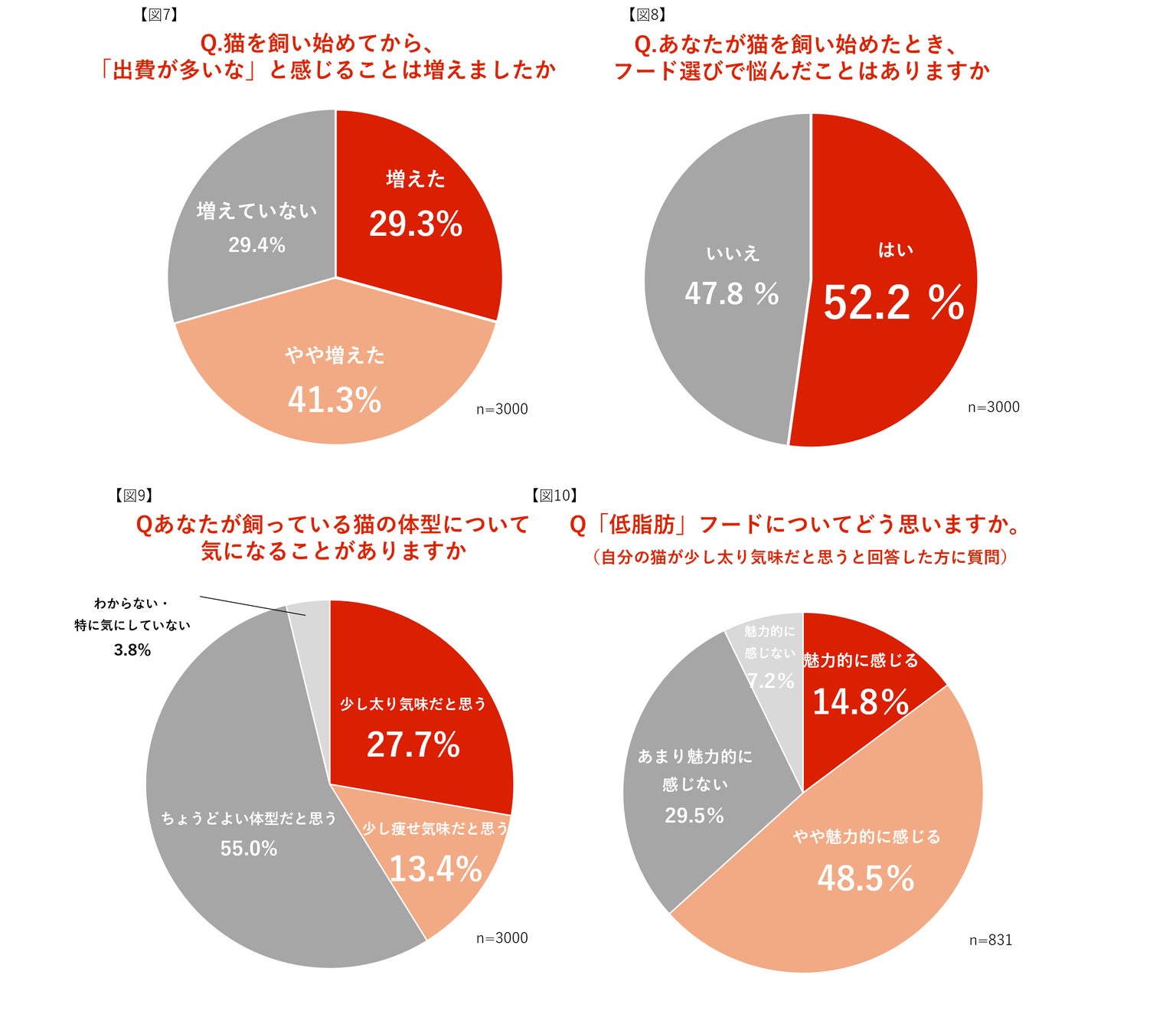 「猫を飼ってから出費が増えた」と実感する飼い主は約7割【図7】と多く、特にフード選びに悩んだ経験を持つ人は過半数にのぼりました【図8】。