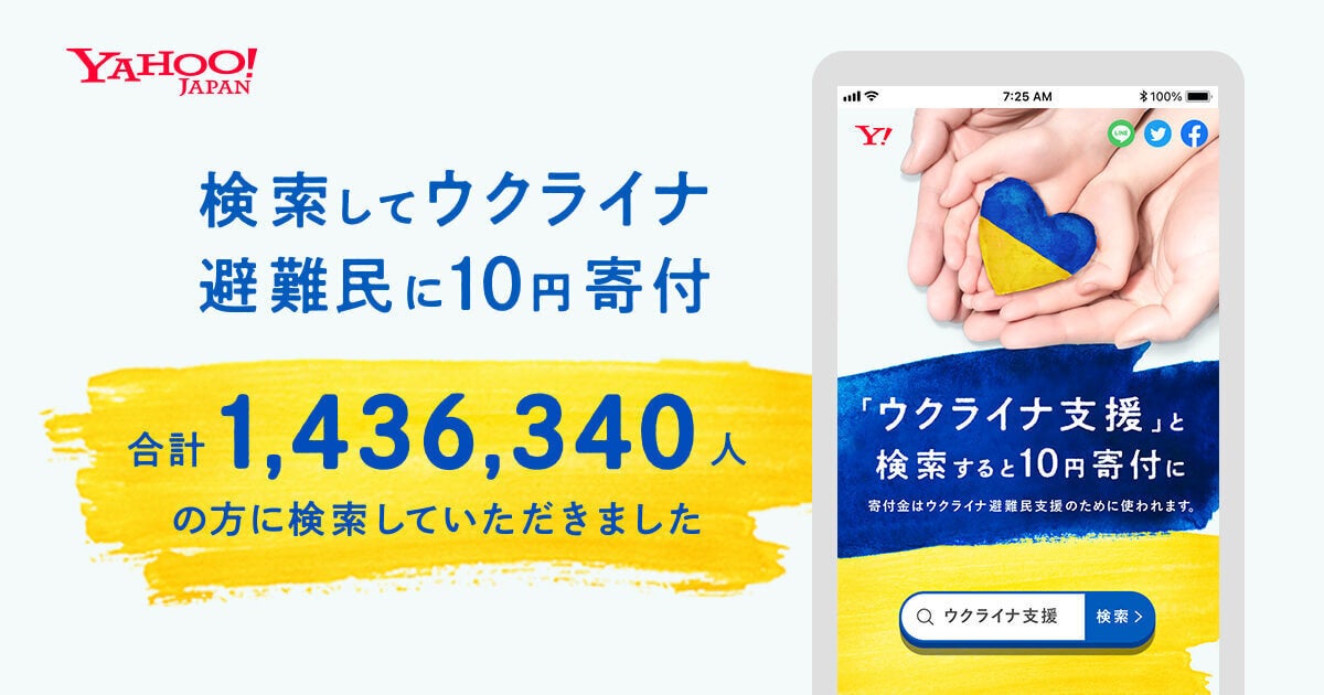 Yahoo! JAPANが実施した、"ウクライナ支援"と検索するとウクライナ避難民の支援活動に寄付できる取り組みに約143万人が参加、約1,436万円を寄付
