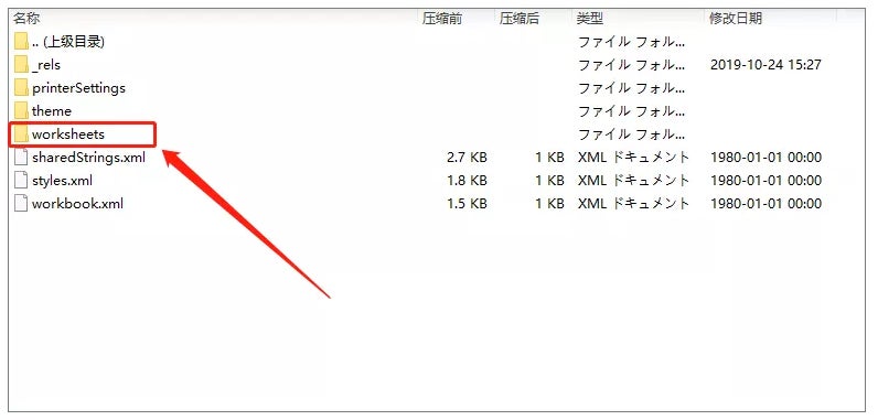 Step4:シート保護を解除したいシート名(ここではSheet1.xml)をクリックします。エクセルファイル内にあるシートの数だけ「シート名.xml」でこの場所に表示されます。