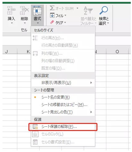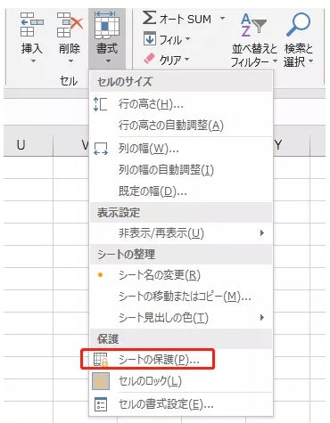 最後は、「書式」からシート保護を設定する方法です。