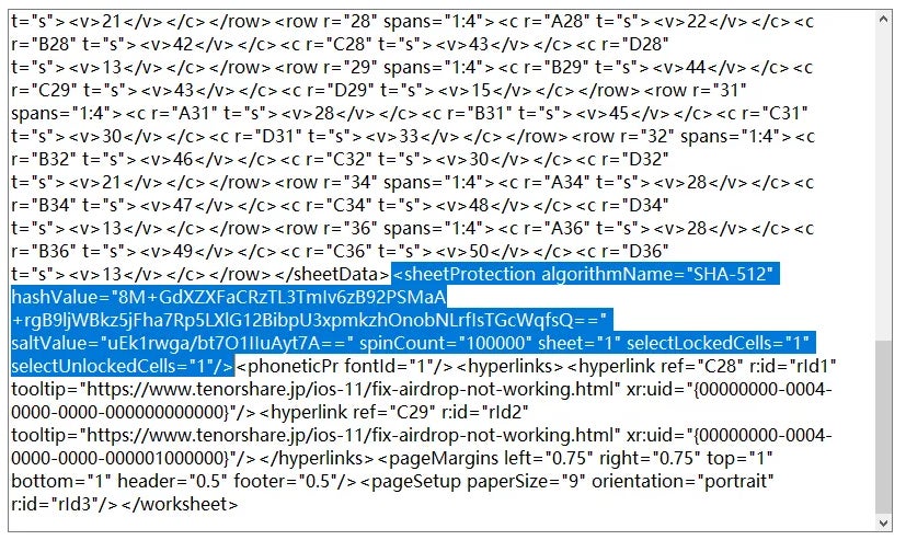Step6:「sheetProtection」を含むシート保護の該当箇所を全て削除し保存します