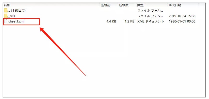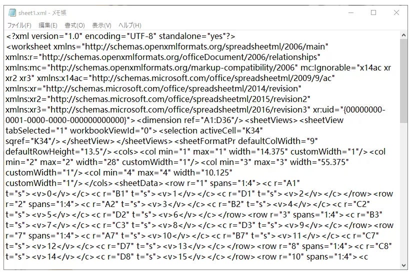 Step5:「Sheet1.xml」をメモ帳で開きます。