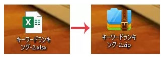 Step1:エクセルシート保護を解除できないエクセルファイルをzipファイルに変更します。エクセルファイルの拡張子「.xlsx」を「.zip」に書き換えます。
