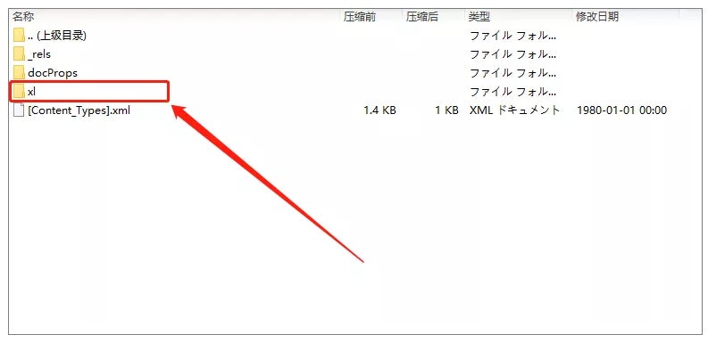 Step2:zipファイルを開いて「xl」ファイルをクリックします。