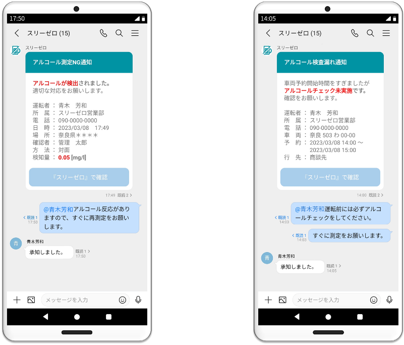 (左:LINE WORKSへの測定NG通知 右:LINE WORKSへの検査漏れ通知)