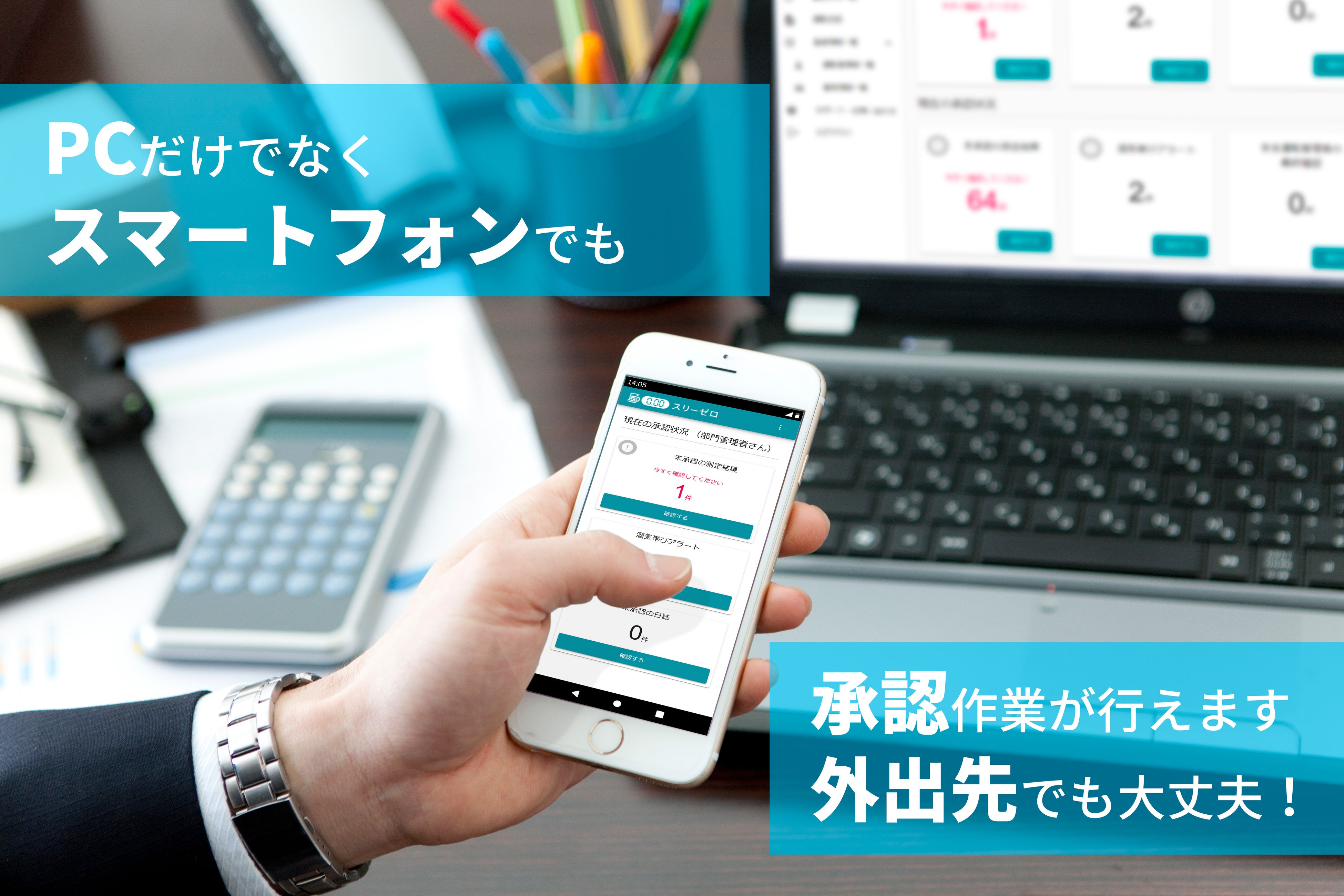 管理者の方がスマートフォンでも管理者画面から確認でき、確認者として設定されている場合は、アルコール測定結果および運転日誌(スタンダードプラン以上)に関して内容の確認と承認作業を実施できます。オフィスでの承認だけでなく、外出先でも対応が可能になり、管理者の利便性が格段に向上しました。