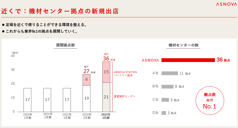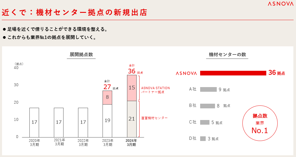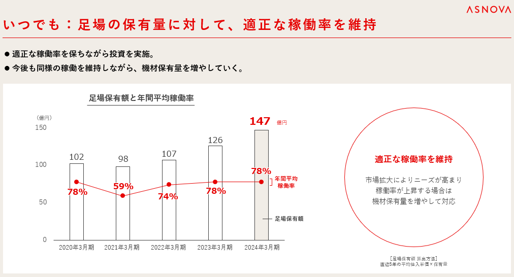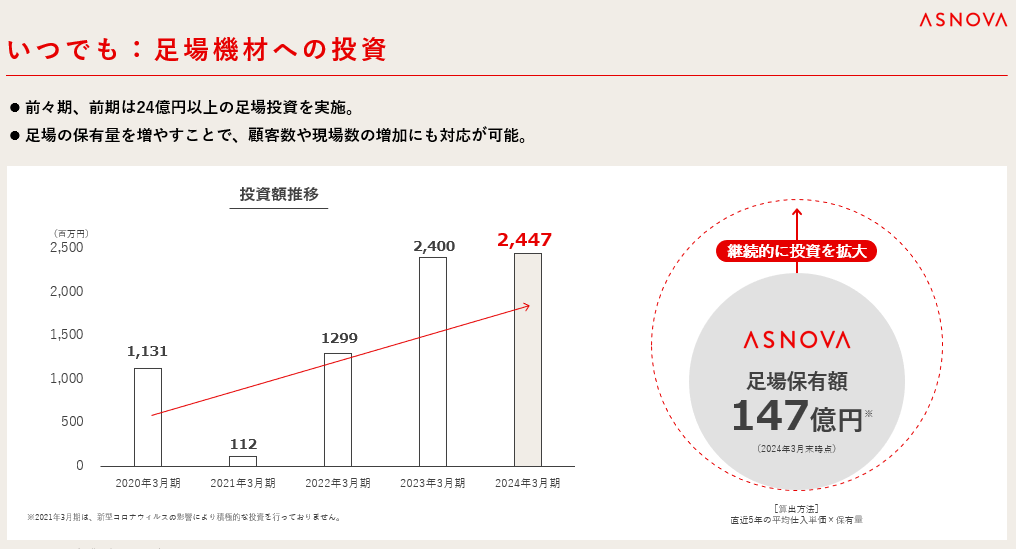 現在、新規顧客の増加とセンター出店に伴い、年間20億円以上の足場投資を行っており、2024年3月末時点で約147億円の足場を保有しております。