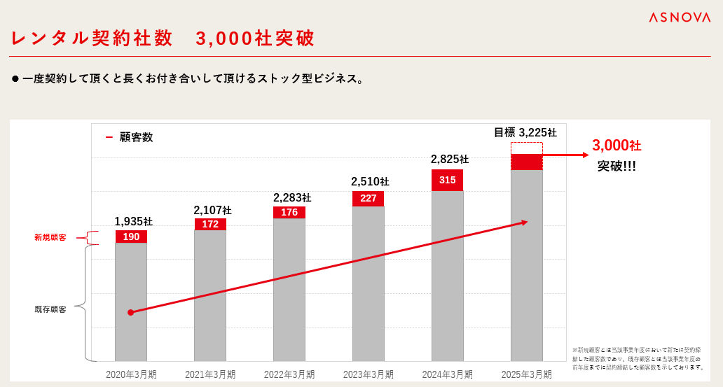 また1度ご契約・ご利用いただけますと継続して長くお付き合いしていただけるお客様が多いことから、当社のビジネスはストック型ビジネスであり安定的な業績拡大の一因に繋がっております。