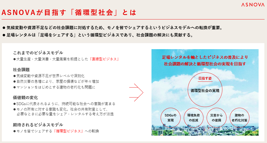 足場レンタルビジネスは足場をシェアする循環型ビジネスであり、今後さらに注目されるビジネスになると考えております。