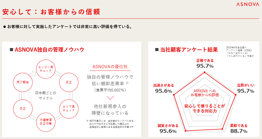今後も顧客満足度を向上させ、レンタル契約社数を増加させることで、「足場といえばASNOVA」と多くの方に認知してもらえるよう努力してまいります。
