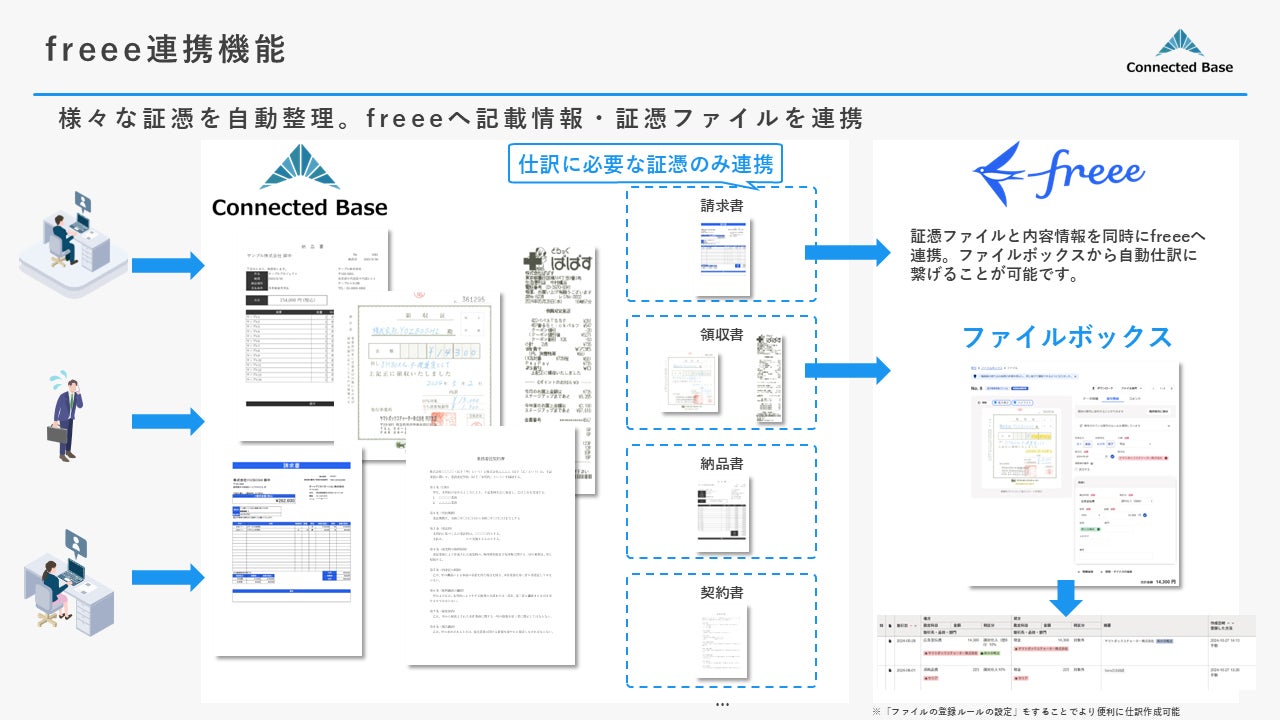 freee会計との連携機能とは、取引書類等のファイル及び解析情報を自動的にfreee会計のファイルボックスへ連携する機能です。