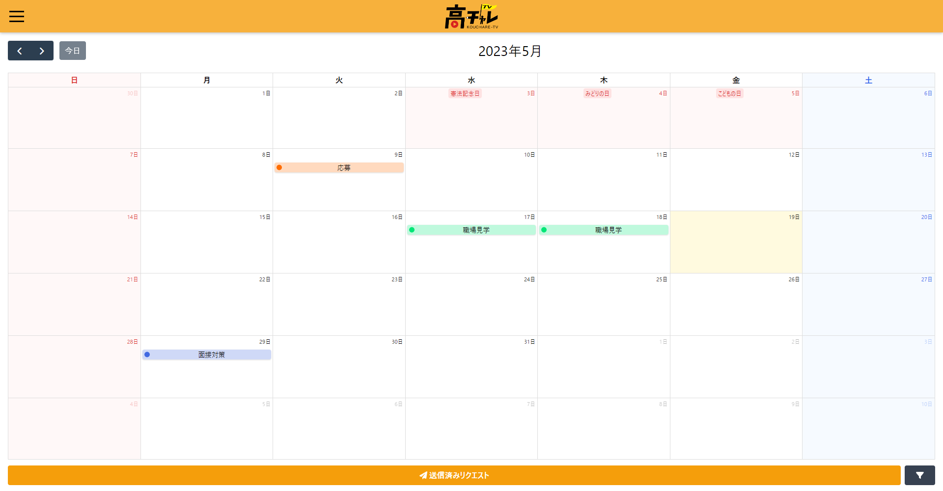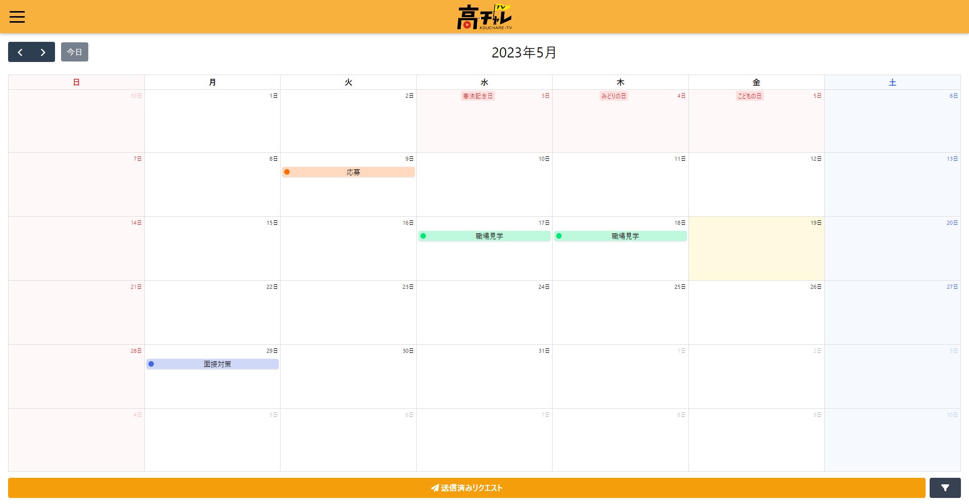 担当の先生が登録した職場見学や面接の日程などが確認出来ます。また、生徒からの面接練習や面談の日程を、担当の先生にリクエストすることができ、生徒と担当の先生がカレンダーを通して共有する事が出来ます。