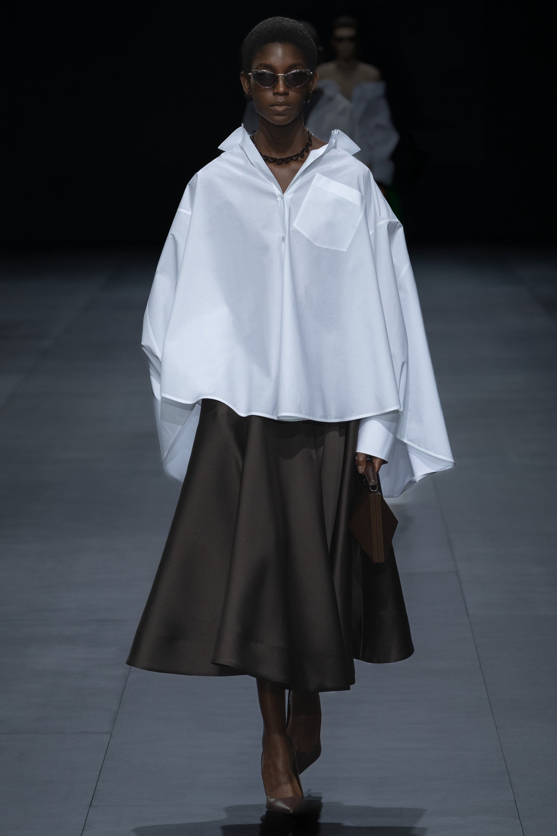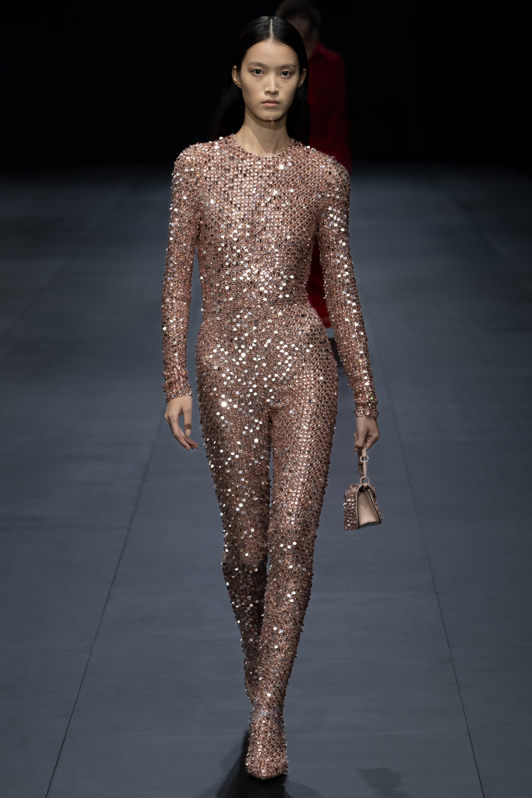 プリーツやボリュームのあるジャケット、ルーシュをあしらったブラウス、カフタンシャツドレスなど、過去のコレクションに登場したヴァレンティノのシグネチャーアイテムの数々。これらのアイテムは構造と素材が新たに見直され、ヴァレンティノのサインとしてコレクション全体に登場します。フェザー、ルーシュ、スパンコールなどの刺繍を施したルックには、クラフトマンシップが存分に生かされています。アクセサリーはさまざまなテクスチャーでデザインされ、ロコバッグやプレシャスなパンプスに新たなバリエーションを加えています。