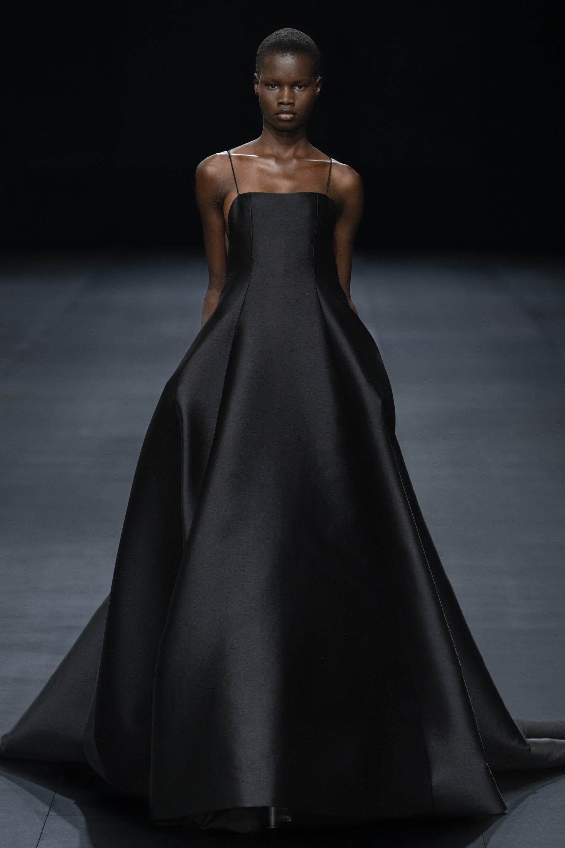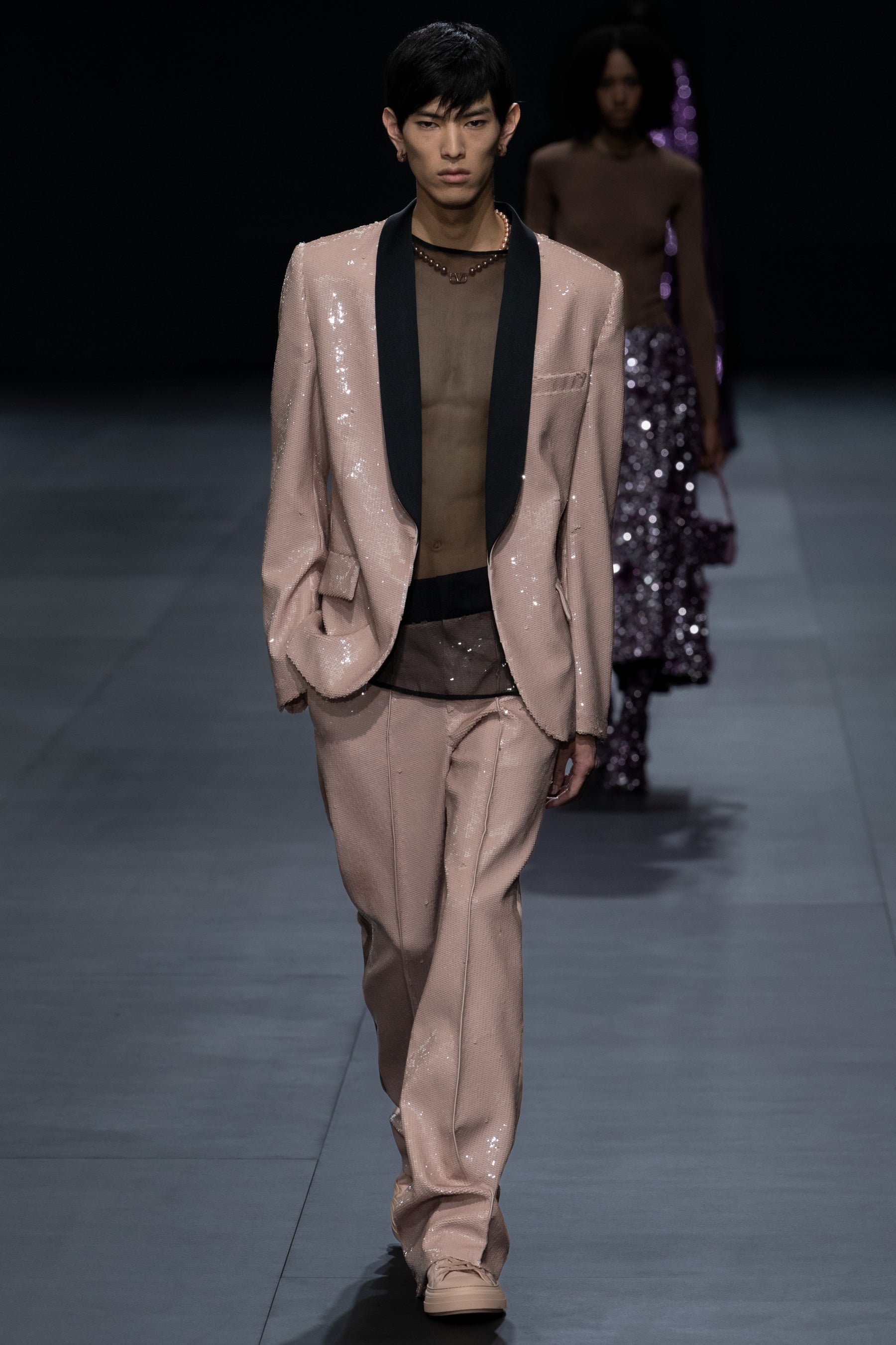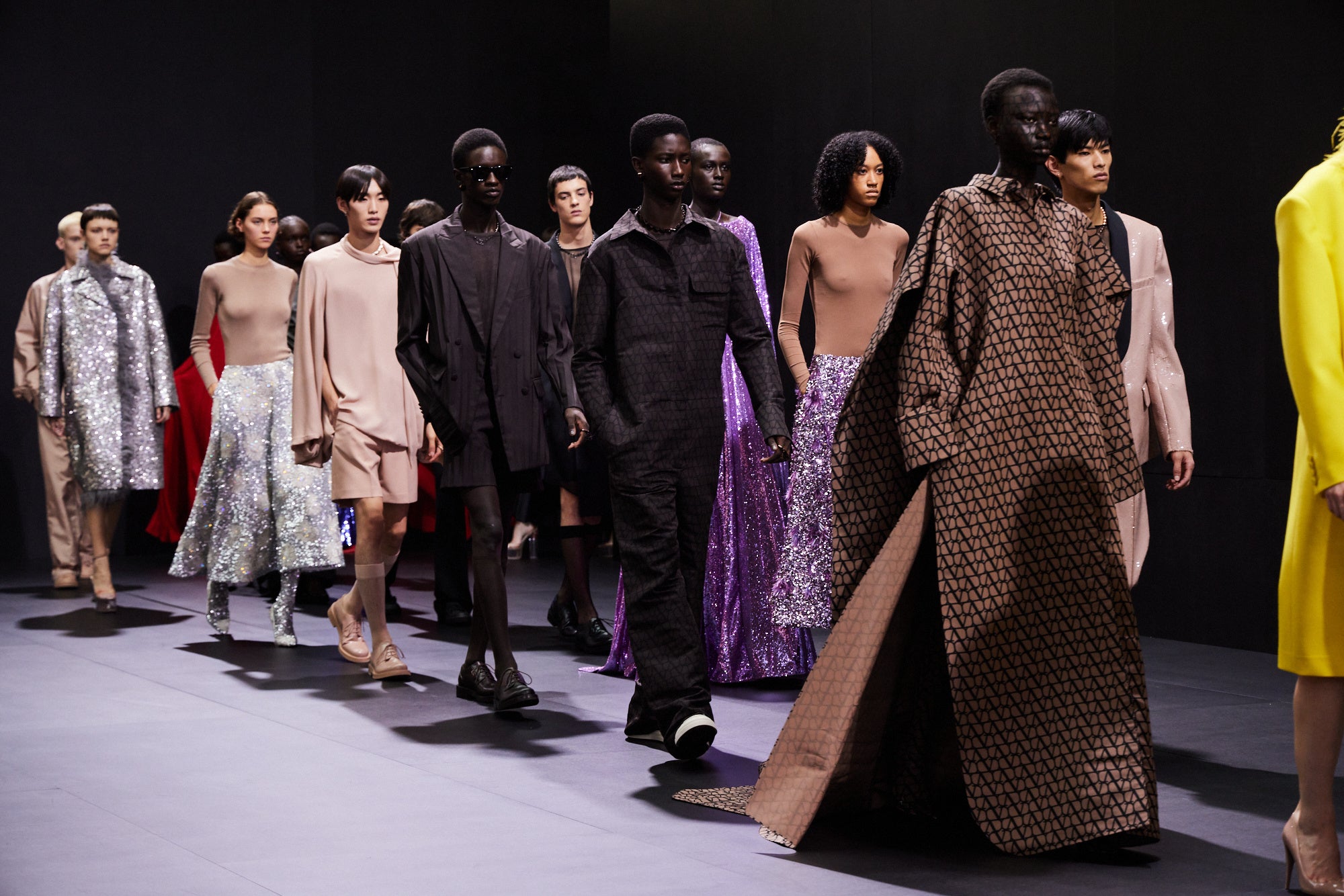 ヴァレンティノのクチュールメゾンとしてのコードはフォーマルウェアに落とし込まれ、コートやパンツ、タキシード、オーバーサイズジャケット、アウターウェアの構造に組み込まれています。刺繍、フェザー、ロマンティックなファブリックの組み合わせが都会的なアティテュードで表現され、現代的でスタイリッシュなテーラリングに昇華されています。クラシックなスーツの伝統はヴァレンティノのクチュールのコンセプトであるボリュームやミニマリズム、ピュアなフォルムによって再解釈され、インクルーシブなプロセスを経て新たな方法で表現されています。