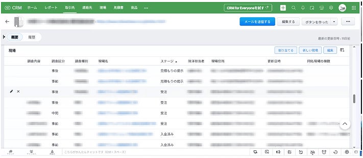 陸洋コンサルタントでは、Zoho CRM を業務の中核に据え、独自の仕組みを構築・運用しています。現場ごとに調査内容、担当者、進捗ステータスから詳細な原価、利益率までをすべての情報を「現場」タブに紐づけて一元管理しています。この仕組みにより、報告書の印刷枚数や交通費などの経費は記録するだけで原価や利益率が 自動で算出されるため、手作業による集計の手間とミスを削減し、経営判断の精度を向上させました。また、案件の進捗状況が全社でリアルタイムに可視化されたことで、情報の抜け漏れや伝達ミスが大幅に減り、部署間の連携も比較的スムーズになりました。これらの取り組みの結果、担当者によっては「1日4時間ほど業務時間が短縮されている」という成果も生まれています。