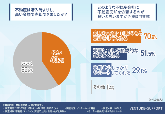 また、不動産購入時よりも高い金額で売却できた人は4割に上る。より高値で不動産を売却するためには、複数の不動産会社に査定依頼するだけでなく、適切な評価・判断のもと売却をしてくれるといった信用できる不動産会社を見つけることが重要であると言える。