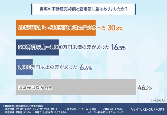 「実際の不動産売却額と査定額に差はありましたか?」と質問したところ、「ほぼ差はなかった(46.3%)」「100万円以上~500万円未満の差があった(30.8%)」「500万円以上~1,000万円未満の差があった(16.5%)」「1,000万円以上の差があった(6.4%)」という結果となった。