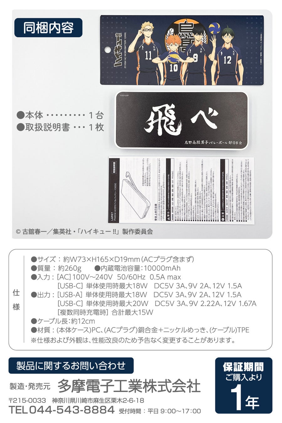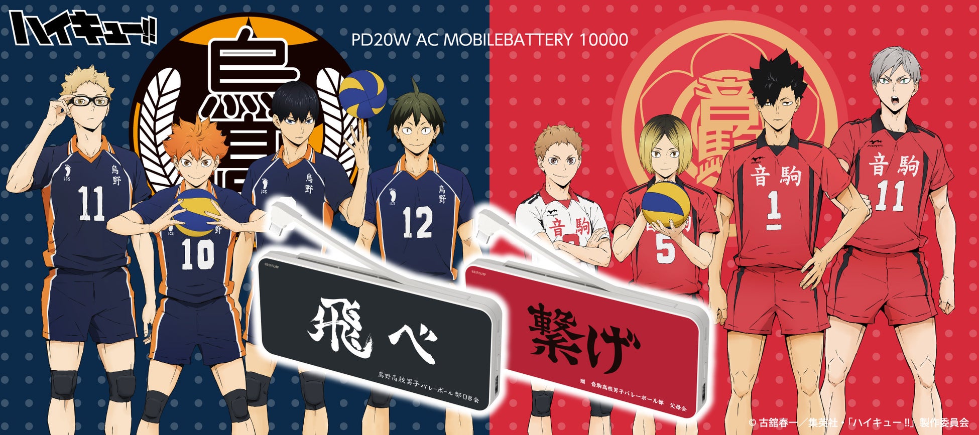 大人気アニメ「ハイキュー!!」の烏野高校、音駒高校の横断幕をデザインしたコンセント付きモバイルバッテリー10000mAhを、10月7日より各ECサイトほかにて販売を開始いたしました。多摩電子工業のアニメ「ハイキュー‼」関連商品の第1弾になります。今後の商品展開にご期待ください。