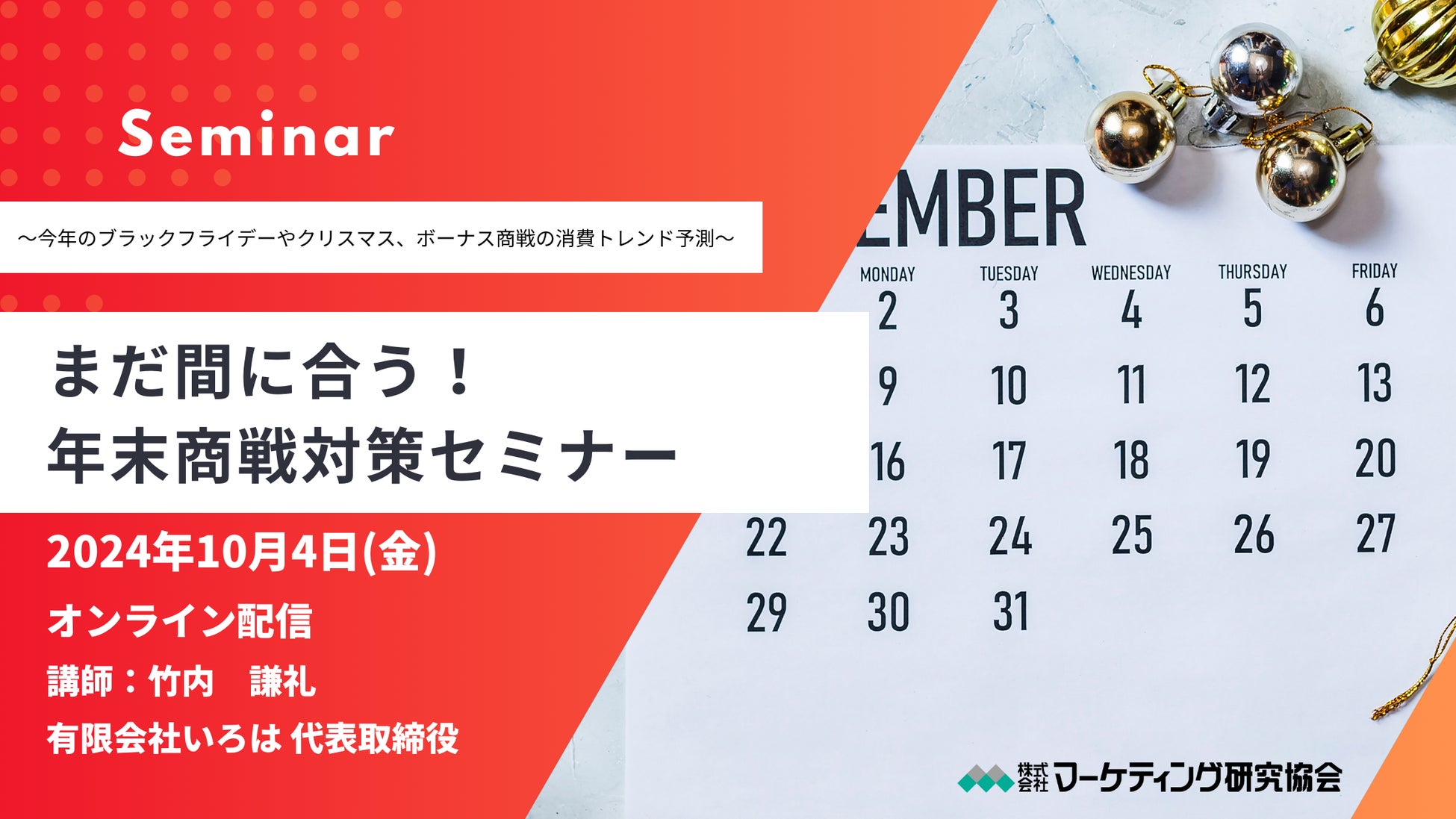 株式会社マーケティング研究協会は2024年10月4日に無料オンラインセミナー「まだ間に合う!年末商戦対策セミナー」を開催します。ブラックフライデーやクリスマス、ボーナス商戦の消費トレンドを予測します。