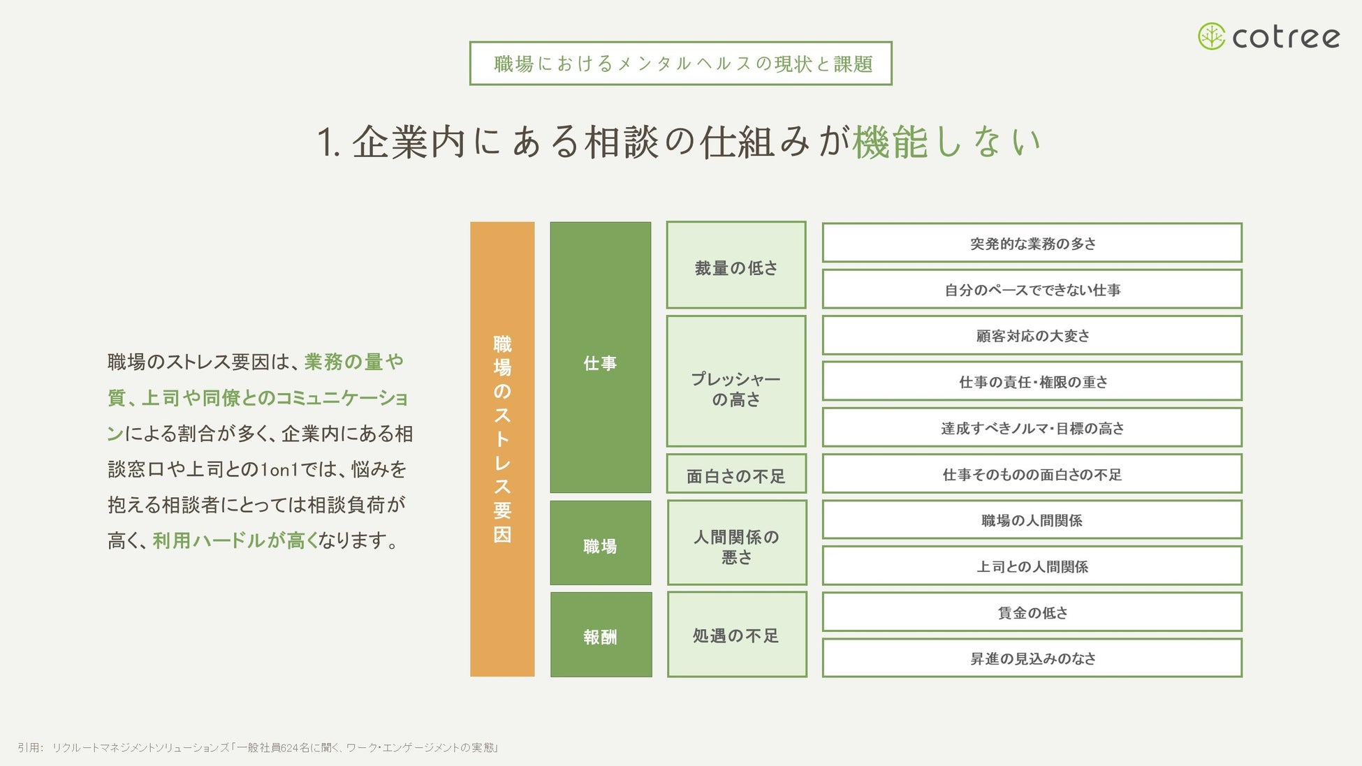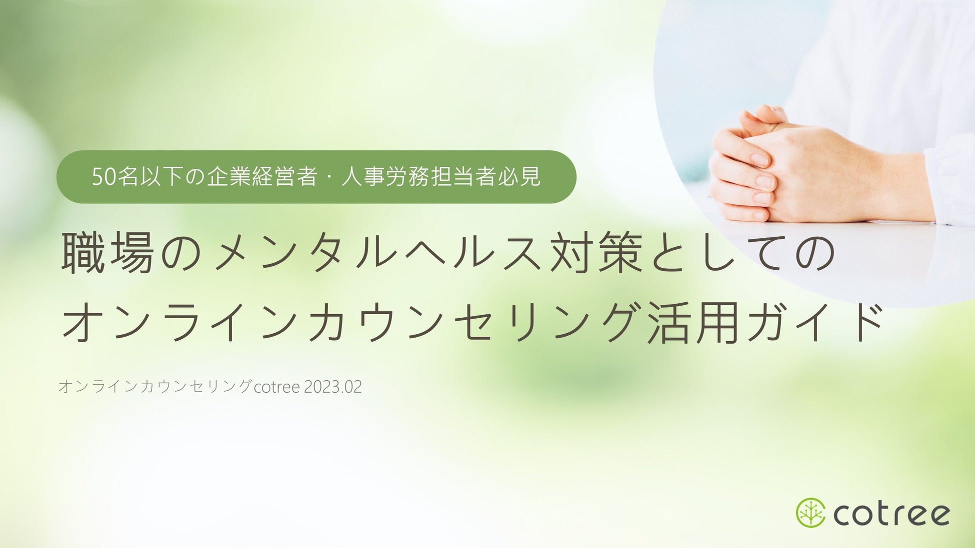オンラインカウンセリング・コーチングの「cotree」を展開する株式会社cotree(本社:東京都港区、代表取締役:西岡 恵子、以下cotree)は、従業員の心身の健康を守り生産性向上を図る健康経営のうち、メンタルヘルス対策についてまとめた「職場のメンタルヘルス対策としてのオンラインカウンセリング活用ガイド」を公開しました。