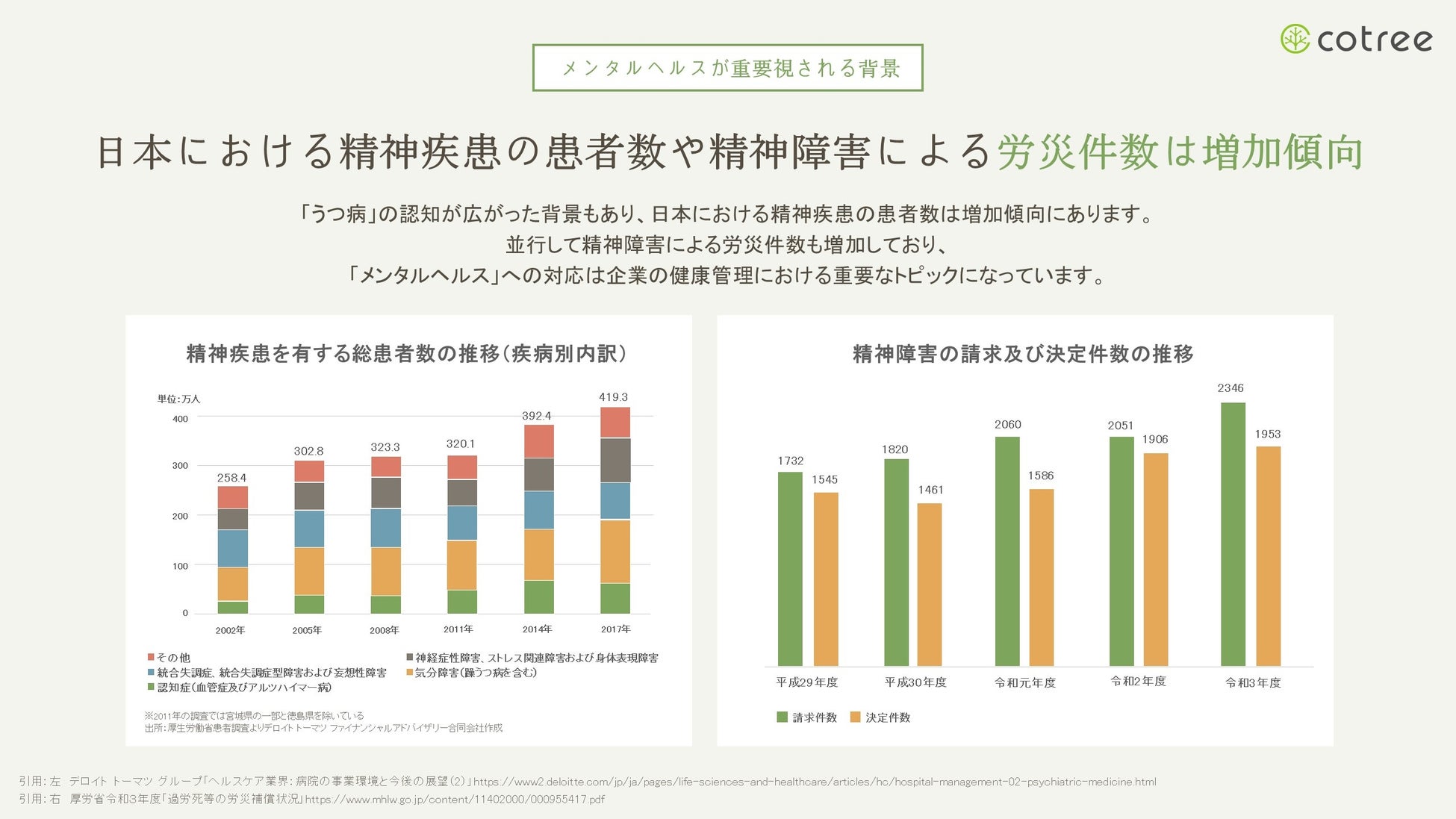 日本における精神疾患の患者数や精神障害による労災件数は増加傾向