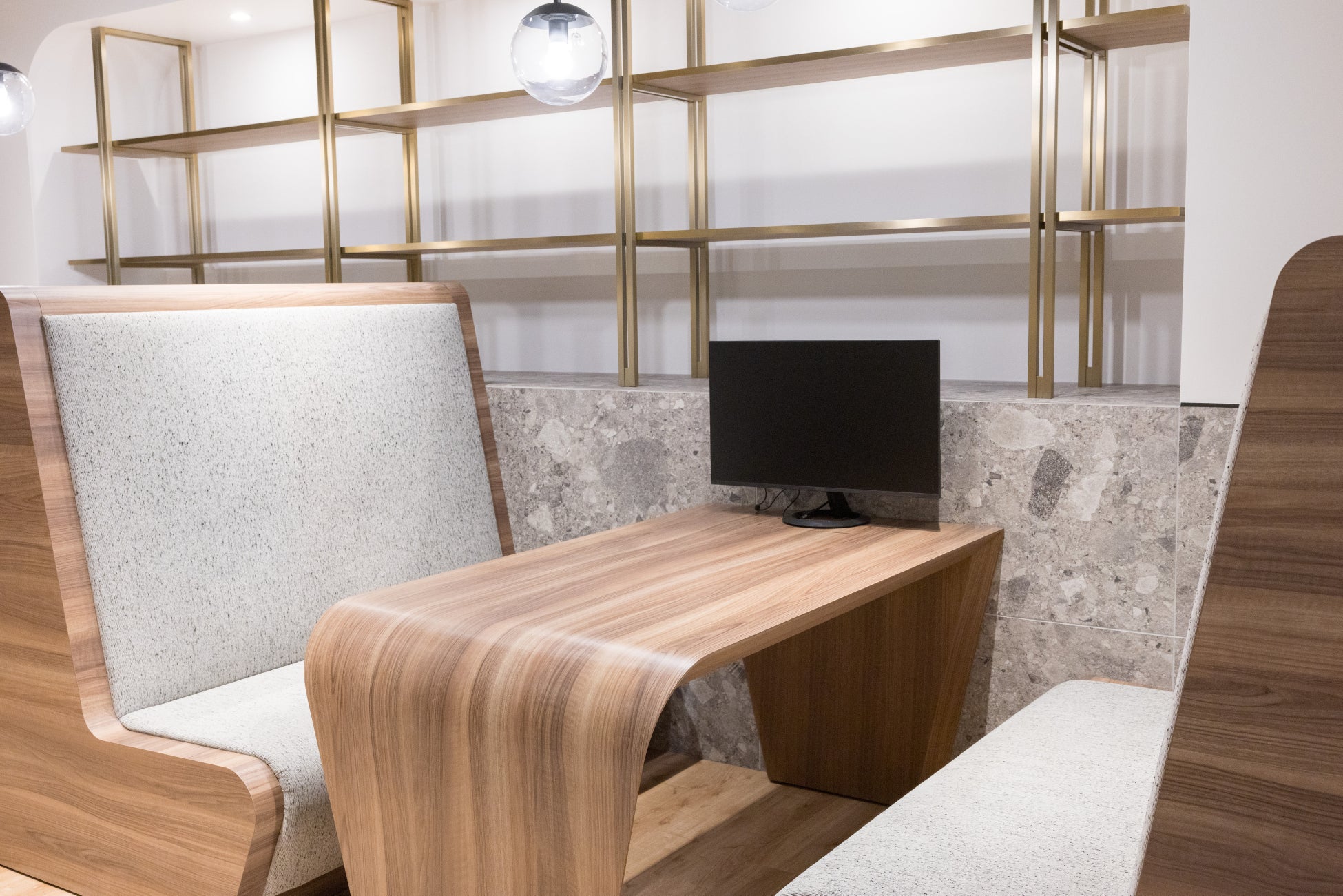 執務エリアには各自のデスクとフォンブースを用意。デスクチェアは、「リラックス×集中力」を開発理念に掲げる国内ブランドの「COFO Chair Pro」を導入しました。