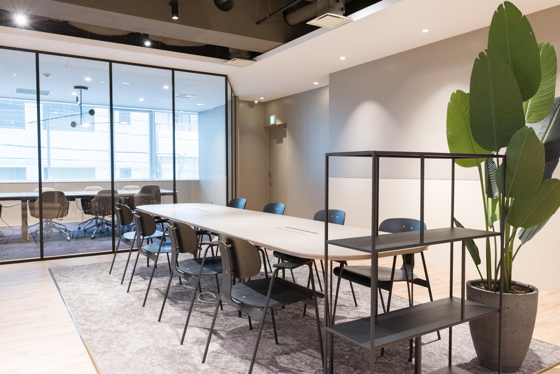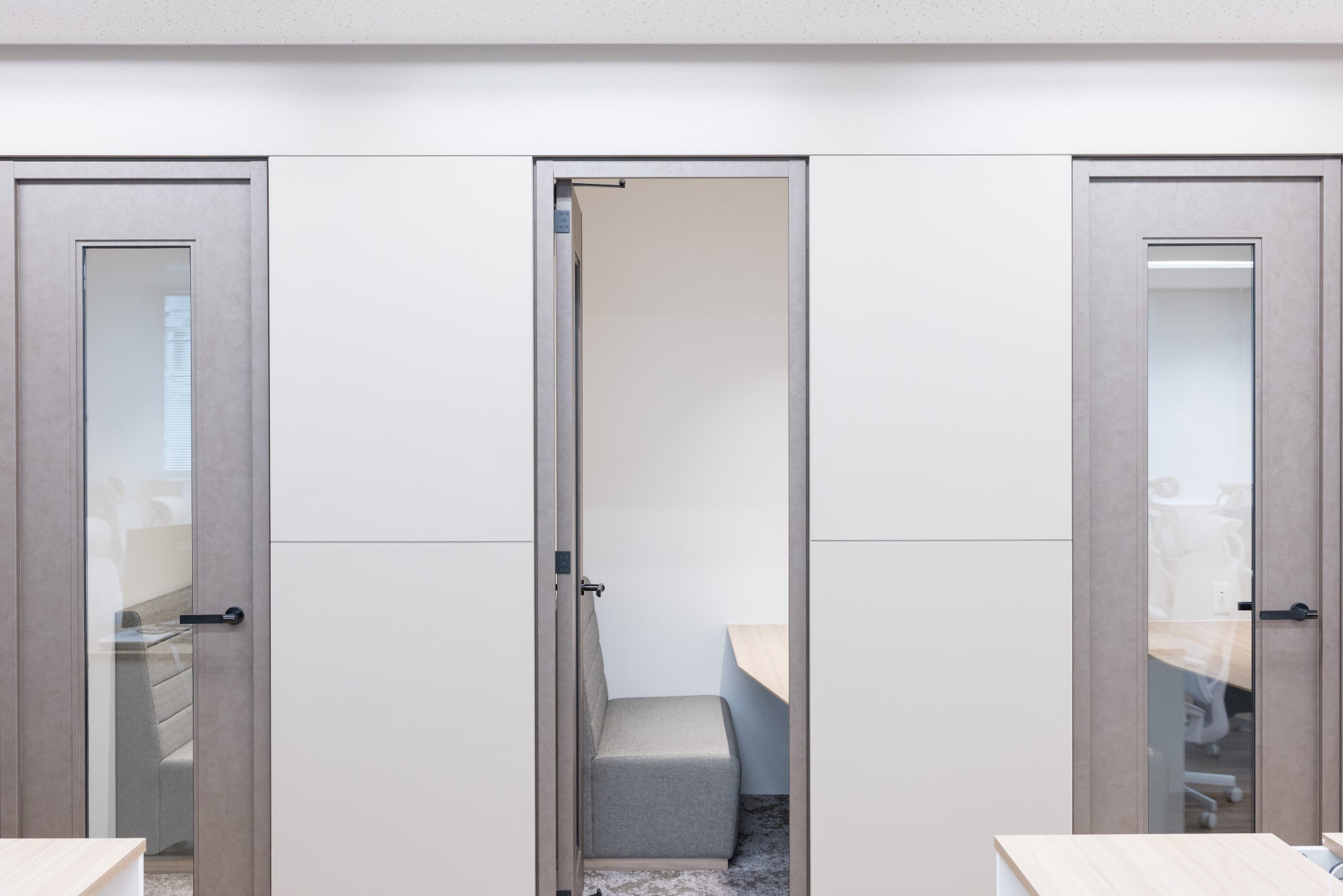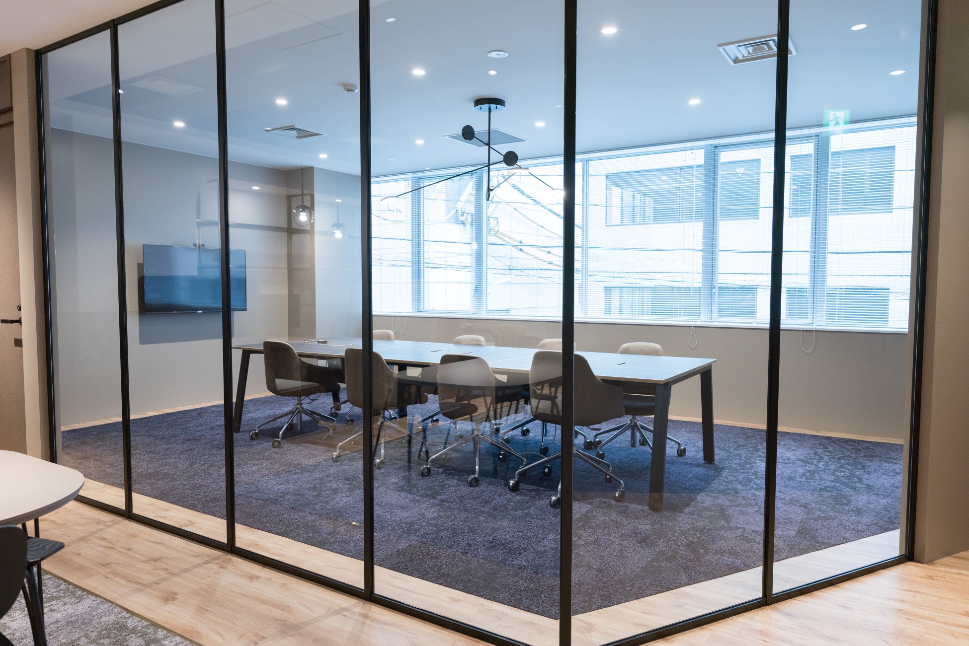 入口の表札にはウォールナットの木材を使用しており、木言葉は”団結”。結束を育む新オフィスの顔です。ラウンジに隣接する2つの会議室はオープンな社風を表しガラス張りを採用。会議室名はこれから社内公募を予定しています。