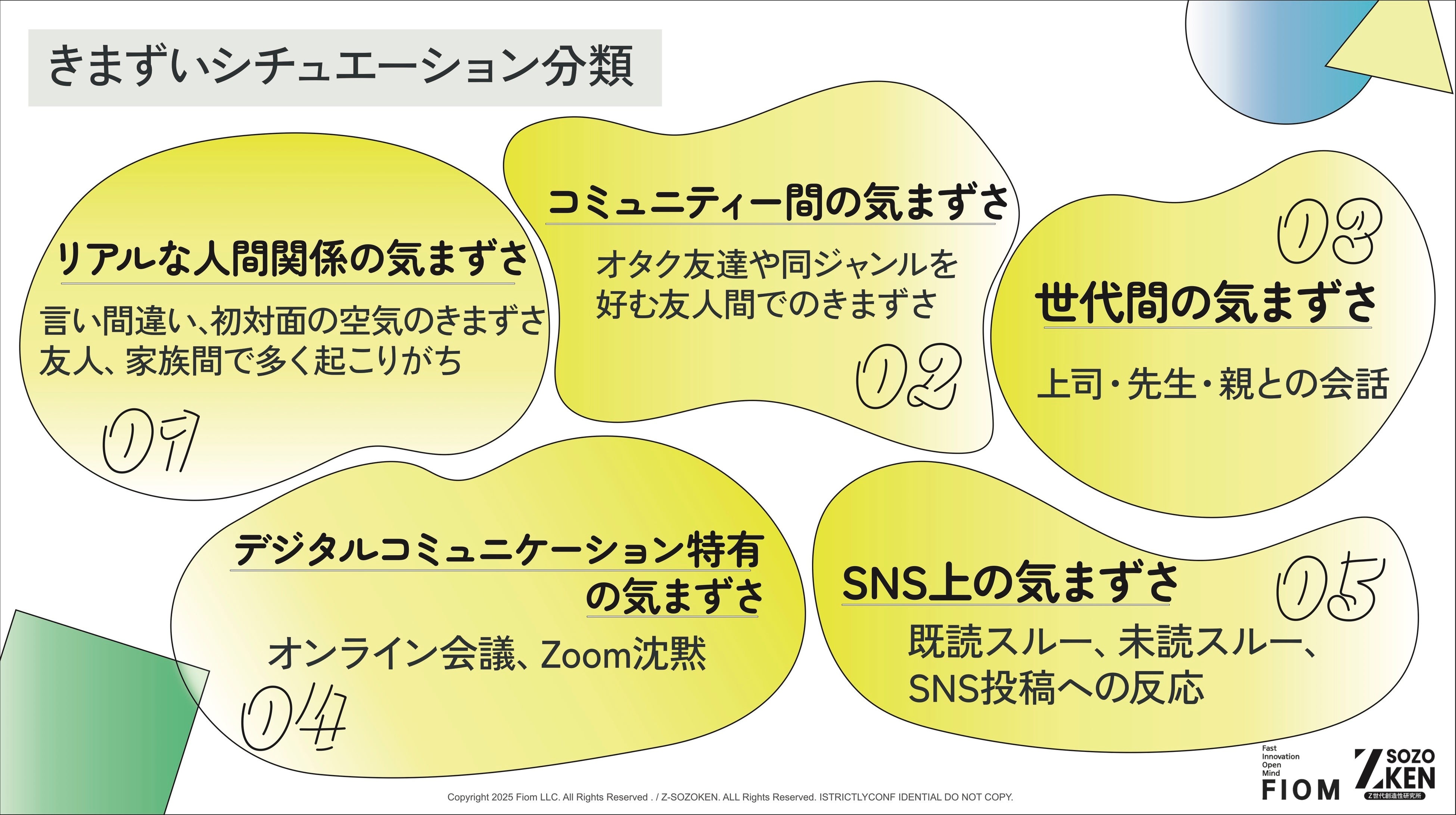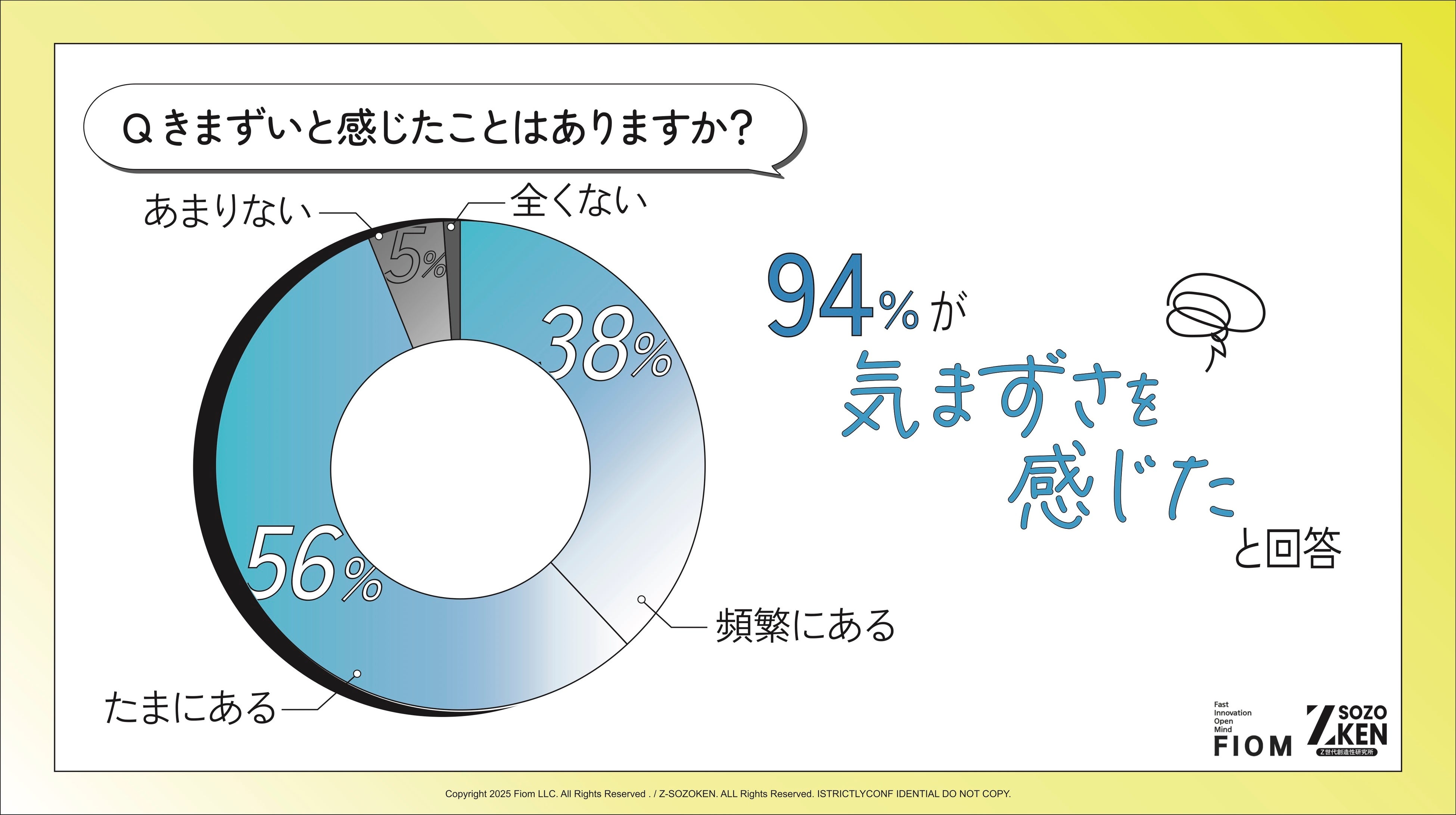 Z世代に特化したクリエイティブカンパニーFiom合同会社(本社:東京都渋谷区、代表社員:竹下洋平)が運営しているZ世代の実態や価値観を分析するシンクタンク、Z-SOZOKEN(Z世代創造性研究所)は、2025年11月17日(月)にZ-SOZOKEN THINKTANK 最新調査研究レポートの第二弾として『Z世代の気まずいの感覚』についての調査研究レポートの第2章インサイトサマリー「Z世代の感じる新感覚、気まずいを深掘り」をリリースしました。