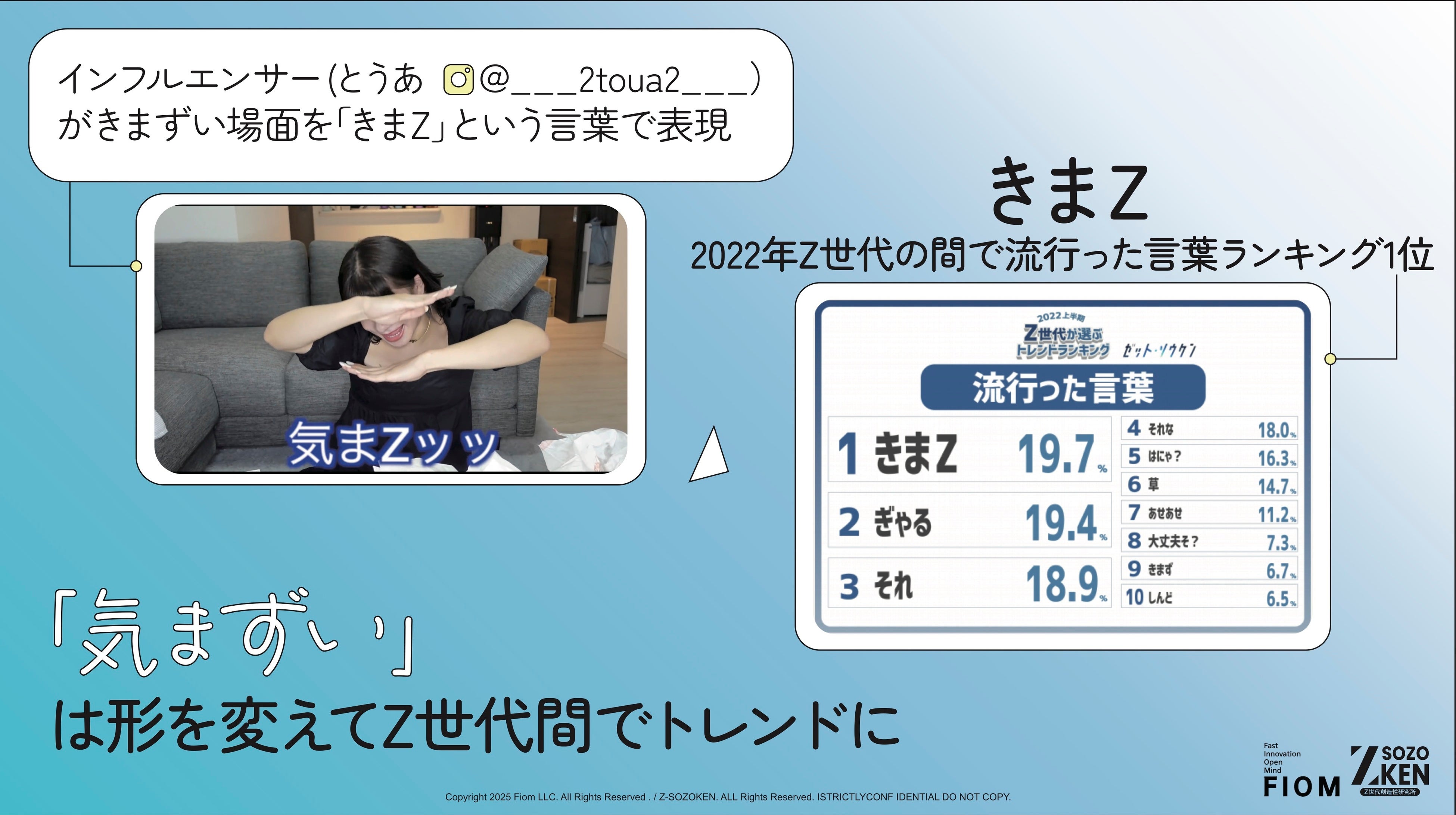 2022年のトレンドランキング1位となった「きまZ」の影響により、気まずい状況をポーズと言葉で「ネタ」にする文化が定着。ネガティブな空気を共有し、笑いに変えることでその場を乗り切る、Z世代独自の処世術として機能しています。