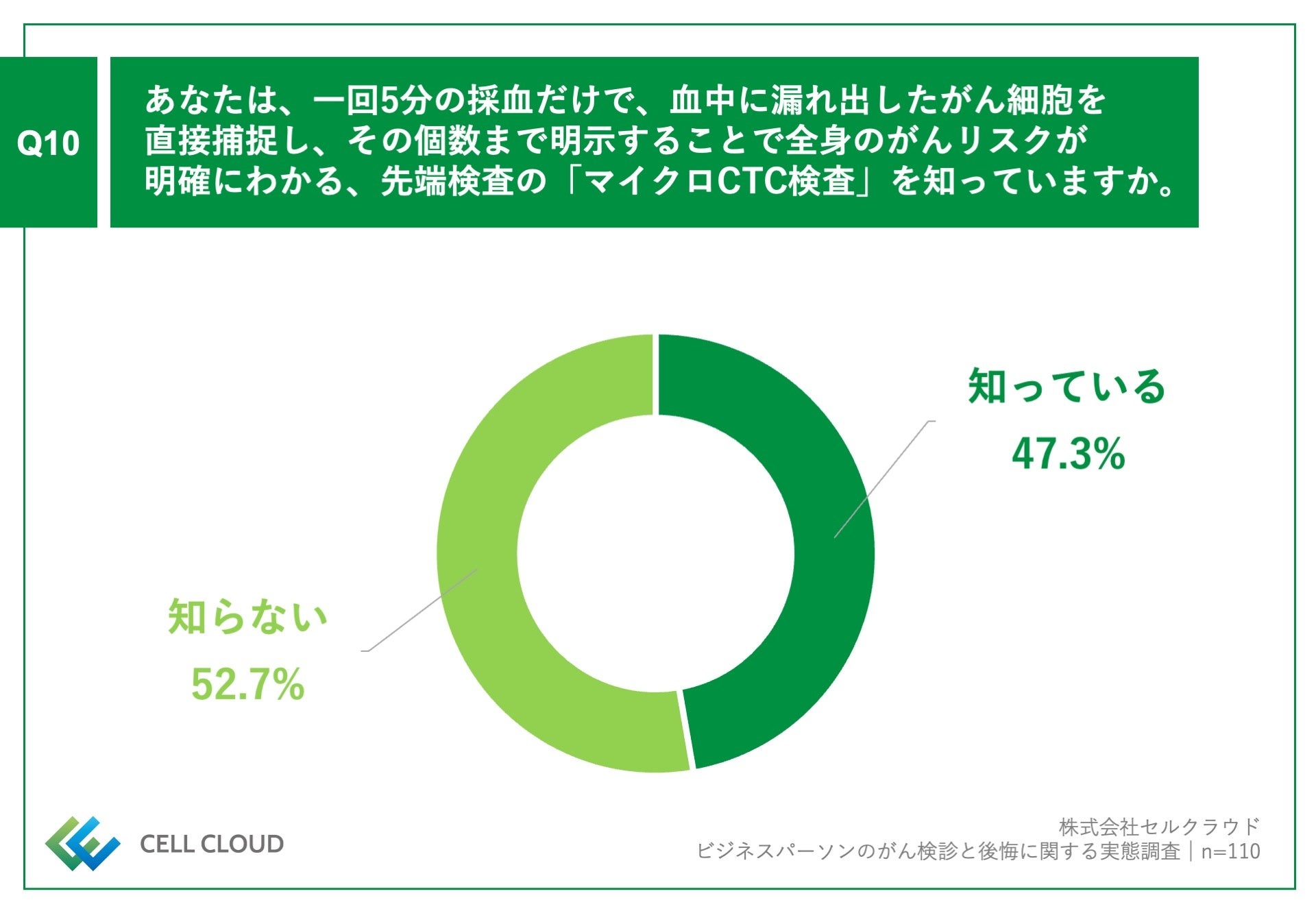「Q10.あなたは、一回5分の採血だけで、血中に漏れ出したがん細胞を直接捕捉し、その個数まで明示することで全身のがんリスクが明確にわかる、先端検査の「マイクロCTC検査」を知っていますか。」(n=110)と質問したところ、「知っている」が47.3%、「知らない」が52.7%という回答となりました。