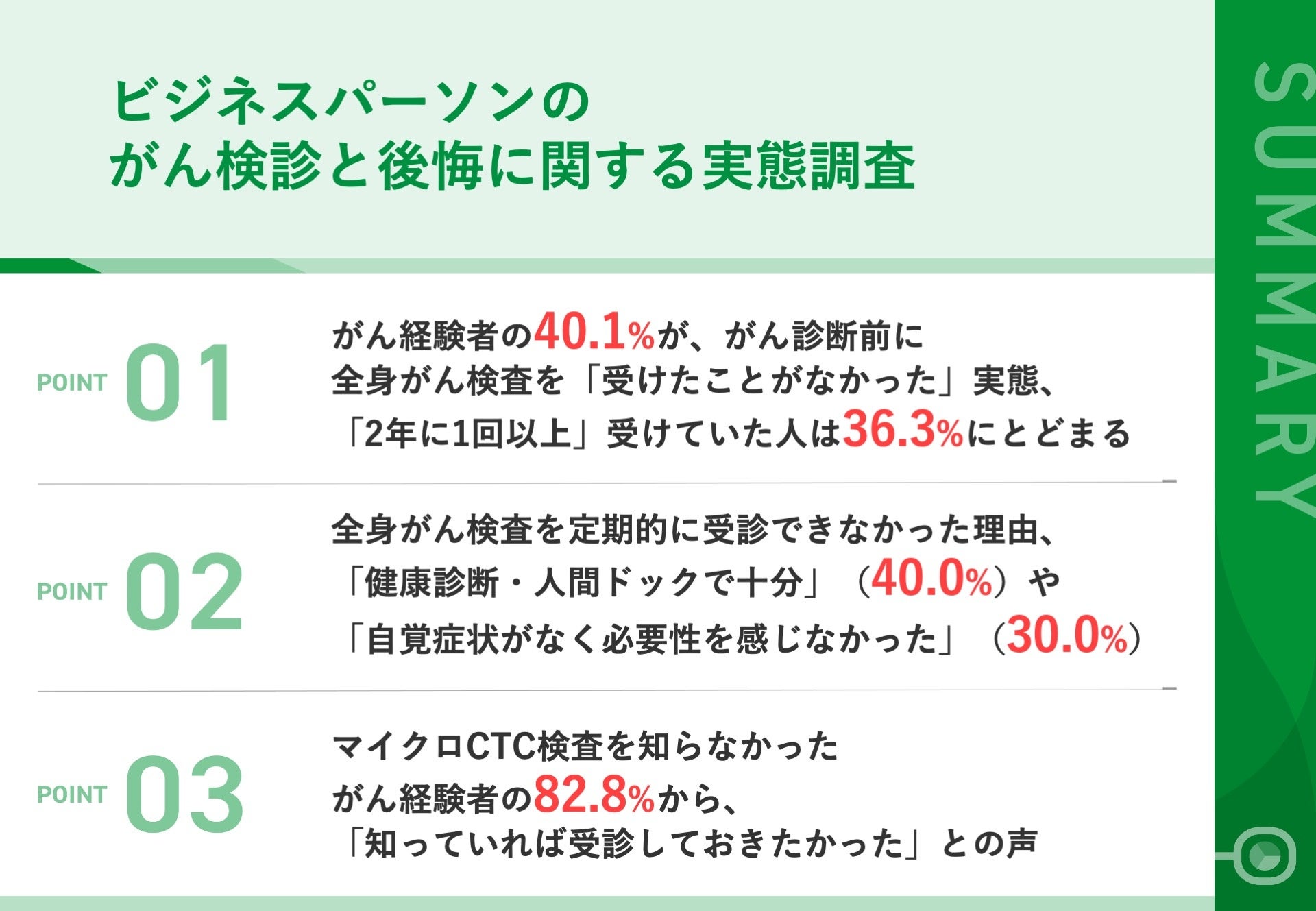 今回の調査では、がん経験者の多くが定期的な検診の重要性を痛感していることが明らかになりました。しかし、多忙な経営層・管理職層のビジネスパーソンにとって、時間確保の難しさが検診を受ける上で大きなハードルとなっています。また、全身がん検査を受けていると回答した人の中でも、実際には部分的な検査にとどまっており、十分な検査を受けていない人が多いという実態が浮き彫りになりました。こうした背景を踏まえると、マイクロCTC検査のように時間的制約や負担が少ないがん検査を活用することで、多忙なビジネスパーソンのがん早期発見に大きく貢献できる可能性があるでしょう。